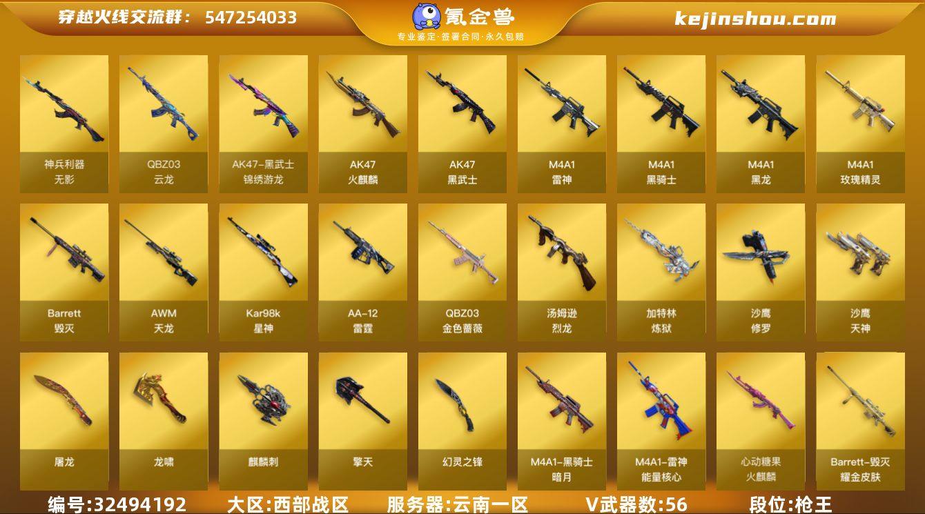 【ylw-cf2130】云南一区-58V-6王者-0炫金 【热门武器】:QBZ03-金色蔷薇,死亡之眼,Kar98K-星神,M4A1-黑骑士,汤姆逊-烈龙*2,加特林-炼狱*5,沙鹰-修罗*6 【稀有皮肤】:雷神-能量核心*2,火麒麟-心动糖果,黑骑士-暗月,毁灭-暗月*3,毁灭耀金皮肤 【角色】:王者影豹,王者潘多拉,零-水下丽影,灵狐者-职业经理,葵,魅影,铁骑荣耀 【人偶武器】:AWM-灵狐-15周年嘉年华,迷你牛魔王 【暴走生化】:死亡之眼,超级对讲机 【挑战大师】:阐释者III,冰龙粉碎者-白马银枪 【英雄级武器】:QBZ03-云龙,幻灵之锋,QBZ03-金色蔷薇,无影-神兵利器,M4A1-雷神*2,M4A1-黑龙,M4A1-玫瑰精灵*2,M4A1-黑骑士,加特林-炼狱*5,汤姆逊-烈龙*2,AK47-火麒麟*2,AK47-黑武士,AWM-天龙*2,Barrett-毁灭*2,AA-12-雷霆,Kar98K-星神,黑武士-锦绣游龙,沙鹰-天神,沙鹰-修罗*6,麒麟刺,擎天*2,龙啸*2,屠龙*4 【特殊枪械】:1黑骑士,2烈龙,5炼狱