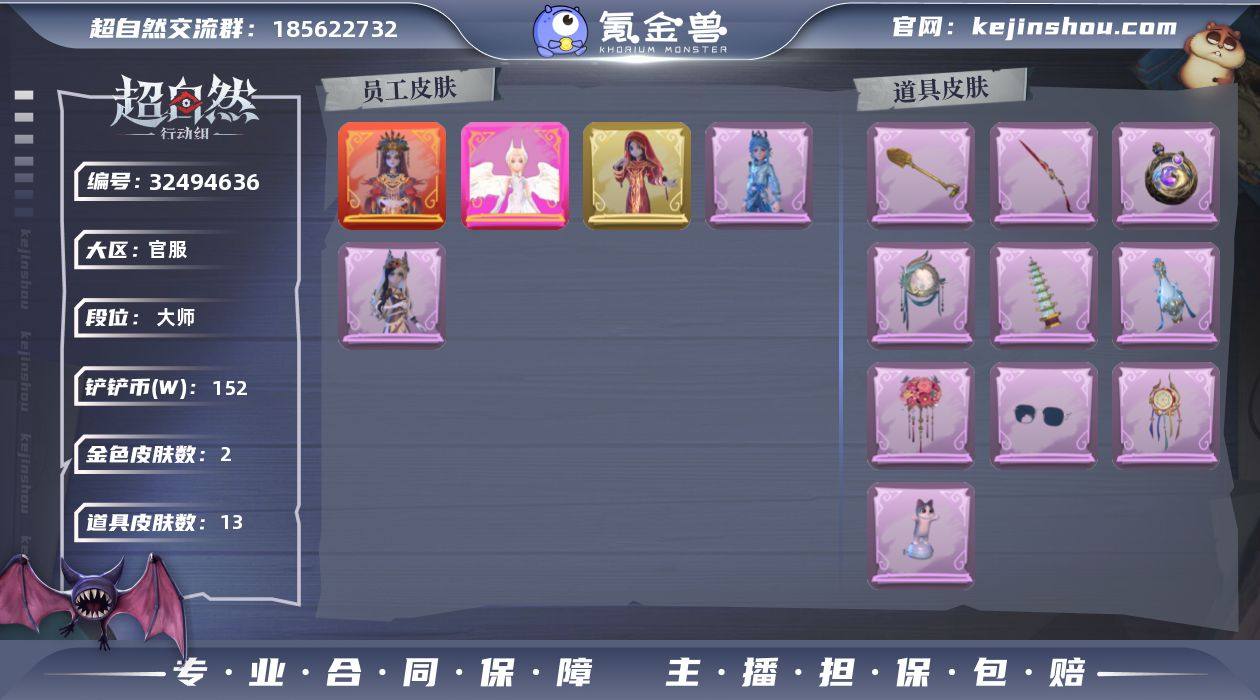 ZR258 段位:大师 红色皮肤数量:1 金色皮肤数量:2 紫色皮肤数量:2 道具皮肤数量:13 铲铲币:1520000 铲铲币(单位W):152 员工:小黄 爱丽丝 零 逍遥 薇薇安 巫铃儿 艾伦 爱德华 小满 外观:巫铃儿 镜生遗梦 小黄 炽天使 巫铃儿 镜花辞 艾伦 水王子 薇薇安 白光莹 道具:夜视仪 金丝眼镜 音响 鸣沙鼓 传送按钮 逆时审判 黄牛能量饮料 青玉抱丹 音响 happy猫 急救包 蔷薇物语 传送按钮 昆仑镜 葫芦 伏妖塔 桃木剑 凤鸣九天 铲子 龙鳞 额外的背包 飞花令 背饰 蝶恋花 头饰:鱼头怪头套 烈焰红唇头套 火爆了头套 面具马头套 哈士奇头套 萨卡班甲鱼头套 嘻嘻头套 滑稽头套 呆滞头套 卑微头套 像素朋克墨镜 后室幸存者头套 挂饰:尘封旧事 九色祥鹿 钗头凤 动作:孤身摇 知世摇 luvaboy 鹏友摇 伤心摇 舞台中心 举牌 抬手 累充:11620金砖 赛季魔盒:普通魔盒