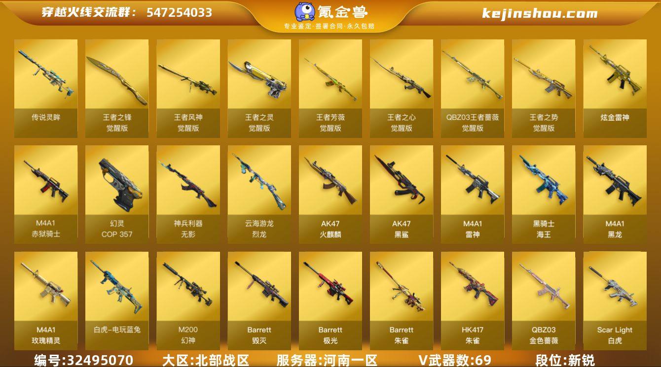【LCFD76】幻神音效卡+双皮+王幻+传说灵眸!河南一区-84V-14王者武器数-1炫金武器数 【传说武器】:传说灵眸 【热门武器】:传说灵眸,QBZ03-金色蔷薇*2,M14EBR-玄武,Scar Light-白虎,HK417-朱雀,M200-幻神,死亡之眼,白虎-电玩蓝兔,Cat-刀锋,毒蜂,汤姆逊-烈龙,加特林-炼狱,羊驼玩偶*3,毁灭-孙三炮,COP 357-幻灵,沙鹰-修罗,柯尔特-赛博朋克,黄金猫猫手套-白鲨 【王者炫金武器】:高爆手雷-雷霆王者*3,炫金雷神 【音效卡】:M200-幻神音效卡,M4A1-雷神-云海游龙音效卡,M4A1-黑龙音效卡,Barrett-碧霄极光音效卡 【皮肤】:M200-幻神-荣耀世冠白鲨,幻神-纸灯龙皮肤,金色蔷薇-纸灯龙皮肤,雷神-暗月,雷神-机甲刑天皮肤,雷神-宇航兔皮肤,M4A1-雷神-巅峰荣耀皮肤,火麒麟-平天大圣,火麒麟-心动糖果,毁灭-暗月,毁灭-战神张飞,毁灭-黑大圣皮肤,M4A1-千变-孔明皮肤,黑龙-能量核心,死神-秘银*2,战神-粉色甜心皮肤*2,战神-紫绶金章皮肤,战神-流金岁月皮肤,AK47-B-常胜将军-刘备,AK47-B-常胜将军-孙权,天龙-秘银,修罗-能量核心,修罗-冠军之魂,屠龙-荣耀世冠AG,龙啸-冠军之啸,龙啸-纸灯龙皮肤,擎天-冠军之击,麒麟刺-荣耀世冠白鲨 【角色】:影...
