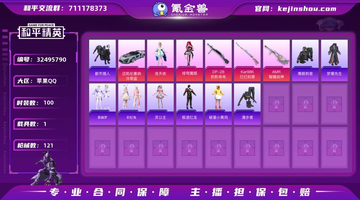 【937581】DYH18036苹果手Q-1载具-2粉装-6特效枪-100套装-121枪皮-6王牌印记-超级王牌5星-33772热力值【1载具】迈凯伦塞纳(冷萃蓝)【2粉装】角色-洛天依,角色-绯穹魔姬【6特效枪】AMR-智耀战神[3级],DP-28-豹影疾电[5级],Mk14-福马献瑞[5级],ACE32-萌骑漫游[3级],Kar98K-巳巳如意[5级],AKS-74U-森灵之息[5级]【1稀有】都市猎人【6飞行器】云朵驼驼飞行器,破刃行动尾迹,马上有福飞行器,狂鲨锋刃飞行器,登顶巅峰飞行器,异域银装飞行器【212其它衣服和枪皮】战术大师,琴音绮想,鹤鸣,灼焰舞者,酒红色名流,SS33特训,潮流炫酷,缤纷果语,龙魂突击队,破蛋小黄鸡,冷焰舞者,幻影武者,疯狂小兔子,SS34特训,王牌教练,猛禽,沙漠毒蛇,角色-瑰梦爱神,黄色伏地魔,SS32特训,青翼流星,恋语绒绒,黄色运动,长空猛禽,大橘大利,竞技名士,角色-孙斩天,燕燕于飞,异域银装,黄色名流,鱼渊荷华,极速红龙,角色-灵公主,白色伏地魔,竞技达人朋克,猎鹰,雪国风尚,SS37特训,元素星魂,冰冻风暴,马上有钱,狙击之神,红色运动,鹰眼刺客,小鸟芋圆,SS31特训,狂鲨锋刃,画境星梦,阳光菠萝,福马献瑞,海盐绵绵冰,双彩圣灵,紫幽梦,春日漫步,擎苍青焰,耀粉歌者,云朵鹅,游乐,滨海厨神,特战装甲,SS36特训,顶瓜瓜,书海巡游,黑色...