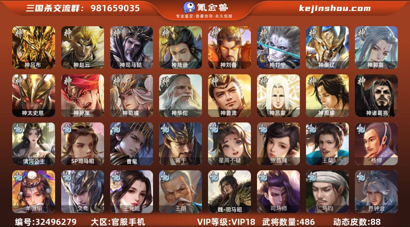 VIP等级: VIP18 官阶: 大将军 武将数量: 486 动态皮肤数量: 88 神将: 神甘宁,神郭嘉,神刘备,神陆逊,神吕布,神司马懿,神孙策,神太史慈,神荀彧,神张辽,神赵云,神吕蒙,神周瑜,神诸葛亮,神鲁肃,神华佗 魏国武将: 刘晔,戏志才,曹纯,曹婴,陈琳,程昱,郝昭,嵇康,界曹真,界于禁,界钟会,马钧,司马师,魏-司马昭,王朗,王元姬,文鸯,羊徽瑜,杨修,王粲,张昌蒲,唐咨-魏,张辽,SP蔡文姬,SP曹仁,SP关羽,SP贾诩,SP姜维,SP庞德,卞夫人,蔡贞姬,曹昂,曹操,曹冲,曹洪,曹丕,曹仁,曹叡,曹嵩,贾逵,王异,张恭,鲁芝,界满宠,曹休,界曹植,满宠,荀攸,王基,钟繇,蒯越蒯良,郭嘉,牵招,荀彧,阮慧,杜畿,界郭嘉,崔琰,界曹丕,界荀彧,朱灵,界甄姬,辛毗,吕虔,界陈群,界王异,界许褚,界郭淮,华歆,陈群,界邓艾,界典韦,界曹休,谋甄姬,袁涣,李通,乐进,辛宪英,谋曹仁,郭淮,毛玠,界曹彰,郭皇后,毌丘俭,夏侯惇,曹植,司马朗,谋于禁,界曹操,星周不疑,许褚,界张辽,谋徐晃,蒋干,张郃,钟会,文聘,曹彰,界夏侯惇,诸葛诞,司马懿,甄姬,界徐晃,徐晃,孙资刘放,韩浩史涣,胡班,曹真,典韦,界夏侯渊,谋荀彧,夏侯渊,李典,于禁,王双,邓艾,界司马懿,张春华,孟达-魏,臧霸,牛金,朱灵(国战),曹髦,李昭焦伯,清河公主,SP司马昭,董昭,谋夏侯渊 蜀国武将:...