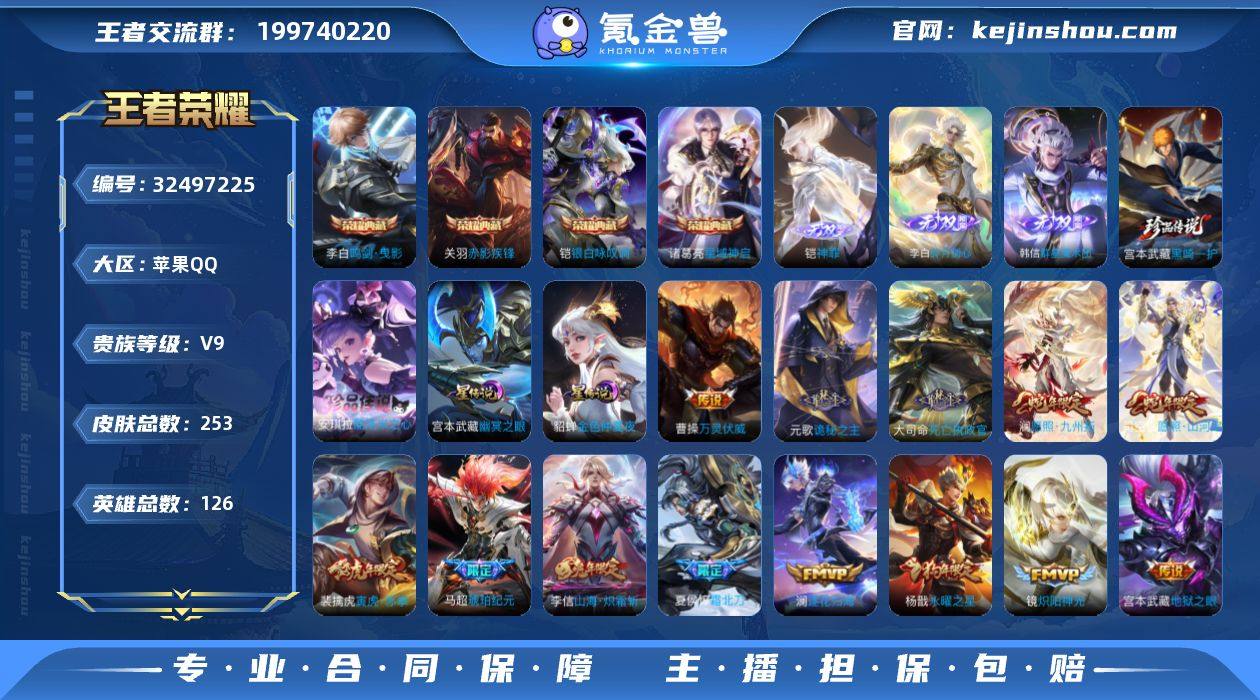 贵族9/皮肤253/典藏4/传说39/史诗58/英雄126/金标典韦/孙权全皮/司空震全皮/空空儿全皮/鸣剑·曳影/星域神启/赤影疾锋/银白咏叹调/神罪/韩信群星魔术团/碎月剑心/幽冥之眼/金色仲夏夜/黑崎一护/酷洛米之心/万灵伏威/诡秘之主/死亡执政官/愿照·山河定/愿照·九州拓/幻光神枪/祥瑞亨通/鸣野蒿/夏侯惇霜北刀/铠冥王哈迪斯/典韦战鼓燎原/琥珀纪元马超/澜逐花归海/霜月吟/惊梅引/妄想实况/浮生妄/画中仙/齐天大圣/山海·炽霜斩/怒海麟威/诗剑行/无双飞将/挚爱之约/寅虎·赤拳/时雨天司/绛天战甲/炽阳神光/启明星使/云鹰飞将/一念神魔/时之恋人-刘备/久胜战神/黄金狮子座/黄金射手座/永曜之星/仲夏夜之梦/地狱之眼/地狱火/Hello Kitty 天幕/天机无算/蒙犽顽岩魄/蔡文姬夏日便利店/虞姬夏日便利店/天穹之誓(s36)/阴阳师/皇家上将/降魔/云间偶戏/魔术师/星际陆战队-达摩/海滩派对/百相守梦(关羽)/傲雪梅枪/至尊宝/云中旅人(s29)/原初追遂者/李小龙/擒涛扼浪(s31)/探海日志(s32)/流音漫舞/地狱燃心/江河有灵/古海寻踪(s33)/鬼谷子天穹祈灯(S34)/妄想食味/龙武盛年/剑破天穹(s35)/芈月浮光幕影/熔金海岸/噬灭天穹(s37)/谧流熔炉/虚灵犬护/逆浪荇歌/荣光之誓/九幽镇关/百相守梦-百里守约/百相...