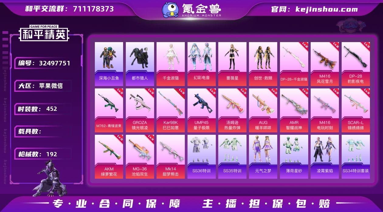 0载具-119套装-192枪皮-2稀有4粉装15特效枪11热门119套装192枪皮 54405热力值 12印记 历史传奇王牌20星 【2稀有】 都市猎人 浪漫天命 【4粉装】 蔷薇星 千金淑猫 创世救赎 幻彩电音 【15特效枪】 SCAR-L-锦绣绵绵 (5级) M416-电玩时刻 (5级) AKM-绿萝繁花 (5级) Kar98K-巳巳如意 (5级) M762-青锋波束 (5级) MG-36-沧焰双生 (4级) DP-28-千金淑猫 (6级) DP-28-豹影疾电 (5级) AUG-暖羊咩咩 (5级) UMP45-量子极限 (5级) Mk14-甜梦熊击 (5级) AMR-智耀战神 (5级) GROZA-镜光银凌 (5级) 汤姆逊-热量炸弹 (5级) M416-风花雪月 (6级) 【11热门】 Mark.06 呆萌铁蟹 鹰眼刺客 激萌罗小黑 深海小丑鱼 NV战队服 暗影哥特 狂沙舞者 漫步者 破蛋小黄鸡 弄潮海豚 【1头盔】 国宝胖达头盔 【1背包】 萌熊伴侣背包 营地ID: