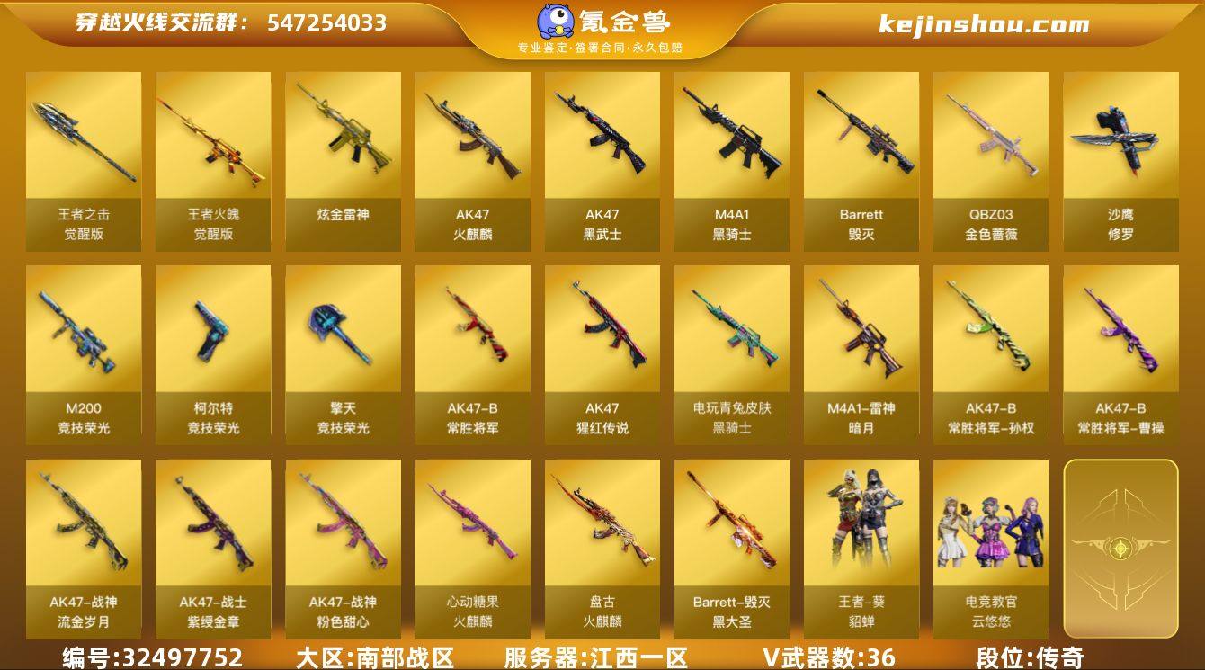 【ky3458】江西一区-37V-3王者-1炫金 【热门武器】:QBZ03-金色蔷薇,M200-竞技荣光,M4A1-黑骑士,COP-白鲨,沙鹰-修罗 【王者炫金武器】:炫金雷神 【音效卡】:QBZ03-金色蔷薇音效卡 【皮肤】:雷神-暗月,火麒麟-盘古,火麒麟-心动糖果,毁灭-黑大圣皮肤,毁灭-神秘黑洞皮肤,黑骑士-电玩青兔皮肤,战神-粉色甜心皮肤*2,战神-紫绶金章皮肤*3,战神-流金岁月皮肤,AK47-B-常胜将军-曹操,AK47-B-常胜将军-孙权*3 【角色】:电竞教官-云悠悠,王者-葵-貂蝉,初恋灵狐,风暴女,嘉年华灵狐,娟娟,龙儿-小淘气,潘多拉-甜心教官,斯沃特-X 【人偶武器】:COP-白鲨,AWM-灵狐-15周年嘉年华,闪光弹-貂蝉,高爆手雷-大乔 【英雄级武器】:AK47-火麒麟*2,M4A1-黑骑士,AK47-黑武士,QBZ03-金色蔷薇,AK-47-猩红传说,王者火魄-觉醒版,AK47-B-常胜将军,Barrett-毁灭,M200-竞技荣光,沙鹰-修罗,柯尔特-竞技荣光*5,擎天-竞技荣光*2,王者之击-觉醒版,高爆手雷-竞技荣光*6,闪光弹-竞技荣光*3,烟雾弹-竞技荣光*5 【道具】:云山科技背包,超级背包,女皇终结者-魔龙之吻,绿色巨人,灵魂忍者,迷雾幽灵,夺命之镰,防化服*3,金色流光-枪王排位*2,星辰流光-枪王排位,防弹...