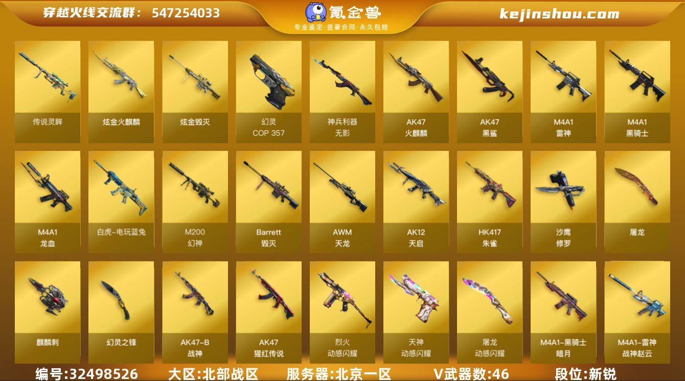 【穿越火线CF-2941】北京一区-46V-5王者-2炫金 【传说武器】:传说灵眸 【热门武器】:传说灵眸,HK417-朱雀,M4A1-青龙*2,M200-幻神*2,白虎-电玩蓝兔,M4A1-黑骑士*2,COP 357-幻灵,沙鹰-修罗*2 【王者炫金武器】:炫金火麒麟,炫金毁灭 【音效卡】:屠龙-动感闪耀 音效卡,M4A1-黑骑士音效卡,Barrett-极光音效卡 【稀有皮肤】:M200-幻神-黄忠皮肤,幻神-巅峰荣耀,幻神-降龙,M200-幻神-荣耀世冠白鲨,幻神-纸灯龙皮肤,白虎-电玩粉兔皮肤,M4A1-战神赵云,火麒麟-平天大圣,火麒麟-心动糖果,黑骑士-暗月,毁灭-冠军之怒,毁灭-黑大圣皮肤 【角色】:王者樱-热浪之夏,王者-迷迭香 【人偶武器】:巴雷特-零-水下丽影,AWM-灵狐-15周年嘉年华,M4A1-雷神-精英刀锋,迷你超能女侍,生化手雷-机甲核心 【暴走生化】:超级对讲机 【挑战大师】:神圣爆裂者-末日III,冰龙粉碎者-白马银枪 【英雄级武器】:COP 357-幻灵,幻灵之锋,烈火-动感闪耀,天神-动感闪耀,屠龙-动感闪耀,手雷-动感闪耀,HK417-朱雀,M4A1-青龙*2,白虎-电玩蓝兔,无影-神兵利器,M4A1-雷神,M4A1-黑骑士*2,AK47-火麒麟*2,AK12-天启,AWM-天龙,Barrett-毁灭,M4A1-龙血,M200-幻神*2,AK47-黑鲨...