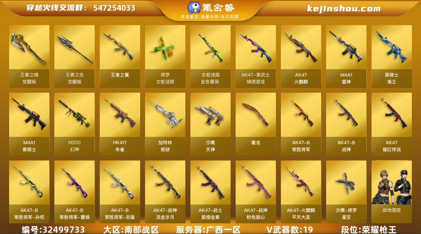 【ky4060】广西一区-20V-5王者-0炫金 【热门武器】:HK417-朱雀,M4A1-青龙,M200-幻神,金色蔷薇-古蛇迷踪,修罗-古蛇迷踪,M4A1-黑骑士,加特林-炼狱 【王者炫金武器】:王者之翼 【音效卡】:M200-幻神音效卡,M4A1-黑骑士音效卡 【皮肤】:幻神-荣耀世冠EP 皮肤,火麒麟-平天大圣,战神-粉色甜心皮肤,战神-紫绶金章皮肤,战神-流金岁月皮肤,AK47-B-常胜将军-曹操,AK47-B-常胜将军-刘备,AK47-B-常胜将军-孙权,修罗-星空 【角色】:战地猎狐,蛇隐宗,娟娟,兰-新年限定,玫瑰花神,潘多拉-甜心教官,潜龙队-X,青霞仙子,蛇姬,蜀雪,铁骑荣耀,雪莉杨,雪莉杨-摸金校尉,智影 【人偶武器】:迷你钢铁终结者,迷你深渊冰龙,迷你牛魔王,闪光弹-小乔,闪光弹-貂蝉,高爆手雷-大乔 【挑战大师】:AK47-冰龙粉碎者 【英雄级武器】:AK47-火麒麟,M4A1-雷神,M4A1-黑骑士,M4A1-青龙,HK417-朱雀,黑武士-锦绣游龙,金色蔷薇-古蛇迷踪,AK-47-猩红传说,AK47-B-战神,黑骑士-海王*2,AK47-B-常胜将军,M200-幻神,加特林-炼狱,沙鹰-天神,修罗-古蛇迷踪,屠龙,王者之啸-觉醒版,王者之击-觉醒版*2,高爆手雷-古蛇迷踪,烟雾弹-古蛇迷踪,烟雾弹-荣耀世冠EP 【道具】:E...