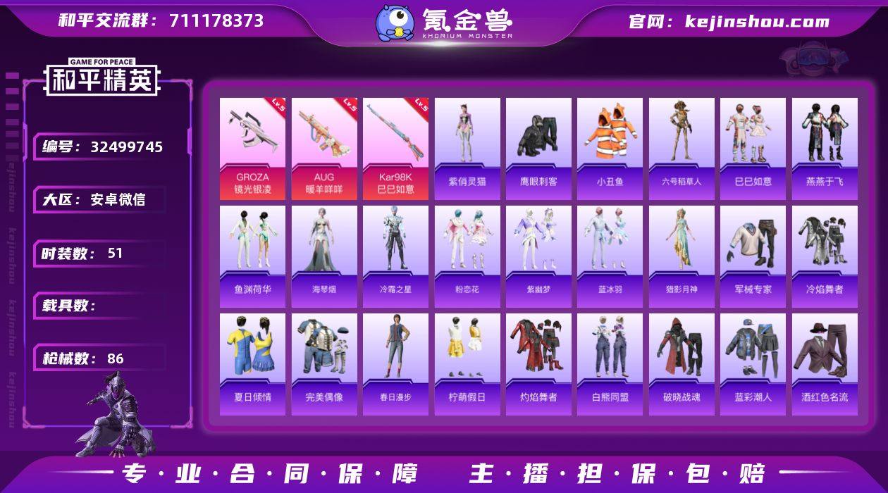 安卓 微信-1粉装-5特效枪-0载具-0粉色飞行器-20616热力值-4王牌印记-51套装-86枪皮 【热门品类】:套装-小丑鱼,角色-六号稻草人 【粉色套装】:角色-罪夜之冕 【粉色枪皮等级】:GROZA-镜光银凌(五级),AUG-暖羊咩咩(五级),ACE32-萌骑漫游(五级),Kar98K-巳巳如意(五级),Mk14-福马献瑞(五级) 【粉色枪皮】:GROZA-镜光银凌,AUG-暖羊咩咩,ACE32-萌骑漫游,Kar98K-巳巳如意,Mk14-福马献瑞 【粉色降落伞】:戏水时光降落伞,雪月幻音降落伞 【稀有套装】:套装-巳巳如意,套装-马上有钱,套装-燕燕于飞,套装-鱼渊荷华,角色-海琴烟,角色-冷霜之星,套装-粉恋花,套装-紫幽梦,套装-蓝冰羽,角色-猎影月神,角色-六号稻草人,角色-紫俏灵猫,套装-雨过天青,套装-红釉青花 【稀有枪皮】:AKM-缤纷海域,AKM-龙的传人,M416-萌萌史莱姆,AUG-天降萌叽,AUG-甜蜜菠萝,M762-天降萌叽,M762-彩虹符号,AC-VAL-天降萌叽,AC-VAL-圣辉之星,AC-VAL-六号稻草人,蜜獾-天降萌叽,UZI-天降萌叽,UZI-炫彩节奏,UZI-月影灵韵,UMP45-夜灯,汤姆逊-炫彩节奏,汤姆逊-像素花束,P90-巳巳如意,Kar98K-影袭,M24-影袭,M24-幻彩电音,SKS-炫彩节奏,SKS-圣域龙灵,Mini14-炫彩节奏,AM...