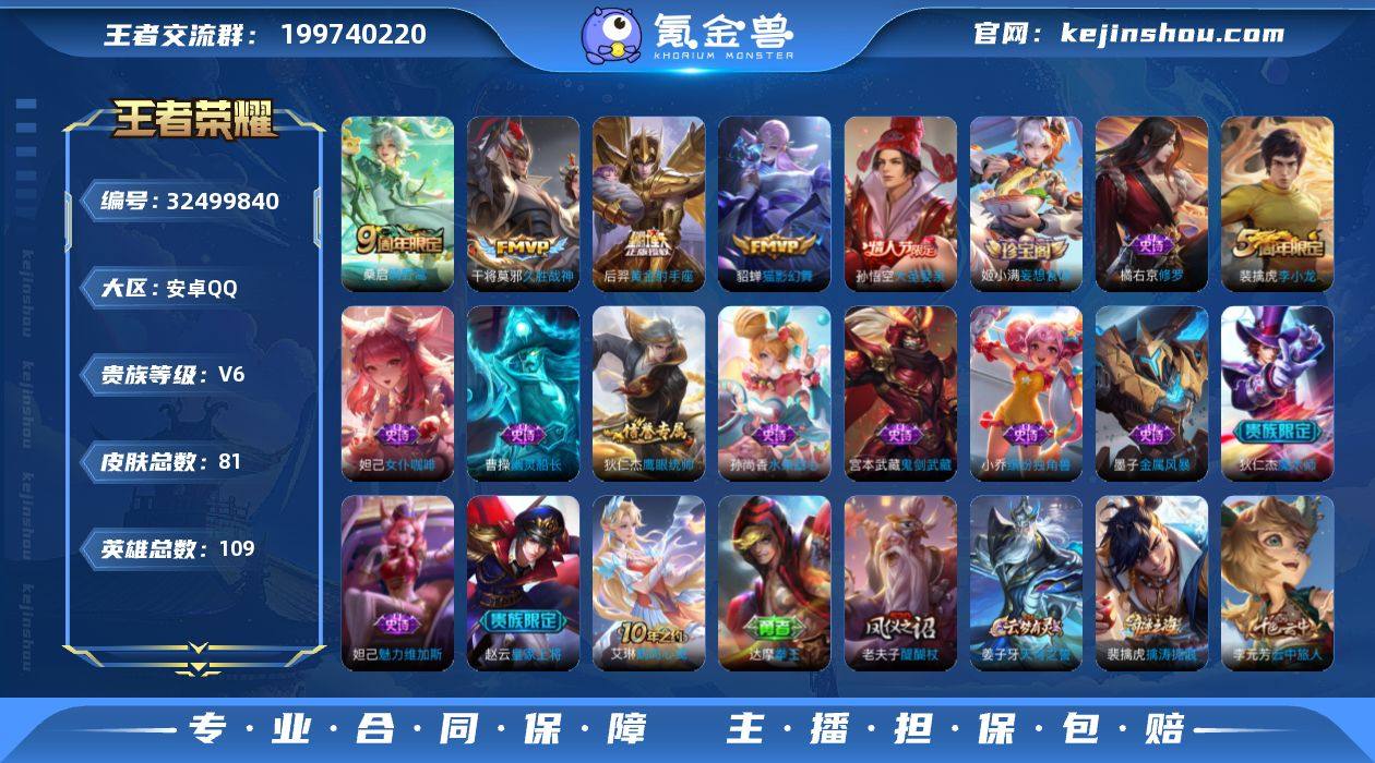 安卓Q-V6-永恒钻石IV段位-109英雄-81皮肤-4传说-14史诗 【传说皮肤】:桑启鸣野蒿,貂蝉猫影幻舞,干将莫邪久胜战神,后羿黄金射手座 【限定皮肤】:姜子牙天穹之誓,狄仁杰阴阳师,赵云皇家上将,狄仁杰魔术师,狄仁杰万华元夜,达摩沙漠行僧,项羽海滩派对,老夫子醍醐杖,程咬金演武夺筹,兰陵王金庭之子,孙悟空大圣娶亲,李元芳云中旅人,钟馗驱傩正仪,鬼谷子原初探秘者,苏烈千军破阵,弈星混沌棋,沈梦溪大漠名商,明世隐疑决卦,裴擒虎李小龙,裴擒虎擒涛扼浪,鲁班大师探海日志,桑启海盐诗旅,姬小满妄想食味 【赛季限定】:弈星混沌棋,明世隐疑决卦,老夫子醍醐杖,鬼谷子原初探秘者,狄仁杰万华元夜,程咬金演武夺筹,钟馗驱傩正仪,苏烈千军破阵,达摩沙漠行僧,兰陵王金庭之子,沈梦溪大漠名商,李元芳云中旅人,桑启海盐诗旅,裴擒虎擒涛扼浪,鲁班大师探海日志,姜子牙天穹之誓 【史诗皮肤】:姬小满妄想食味,裴擒虎李小龙,橘右京修罗,狄仁杰鹰眼统帅,孙悟空大圣娶亲,小乔缤纷独角兽,曹操幽灵船长,墨子金属风暴,妲己女仆咖啡,妲己魅力维加斯,孙尚香水果甜心,宫本武藏鬼剑武藏,狄仁杰魔术师,赵云皇家上将 【其他皮肤】:艾琳鹤鸣心笺,姜子牙天...