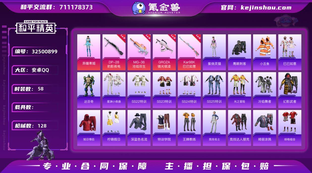 【kyhp1138】安卓 手Q-2粉装-7特效枪-0载具-2粉色飞行器-30345热力值-4王牌印记-58套装-128枪皮 【热门品类】:套装-小丑鱼 【粉色套装】:角色-异瞳寒姬,角色-罪夜之冕 【粉色枪皮等级】:GROZA-镜光银凌(五级),AKS-74U-森灵之息(五级),Kar98K-巳巳如意(五级),Mk14-福马献瑞(五级),DP-28-豹影疾电(五级),PKM-萌骑夺宝(五级),MG-36-沧焰双生(五级) 【粉色枪皮】:GROZA-镜光银凌,AKS-74U-森灵之息,Kar98K-巳巳如意,Mk14-福马献瑞,DP-28-豹影疾电,PKM-萌骑夺宝,MG-36-沧焰双生 【粉色飞行器】:炫彩糖果飞行器,极意拳锋飞行器 【粉色降落伞】:炫光之旅降落伞,忍者神龟降落伞,幻彩电音降落伞,炫彩糖果降落伞 【稀有套装】:套装-巳巳如意,套装-雪国风尚,套装-炫彩糖果,套装-马上有钱,角色-达芬奇,套装-星渊小夜曲,角色-紫俏灵猫,套装-雨过天青,套装-红釉青花 【稀有枪皮】:AUG-冰晶雪宝,AKM-彩虹符号,AKM-影袭,AKM-破晓战魂,AKM-龙的传人,M16A4-红色方程式,M16A4-蓝色火焰,SCAR-L-炫彩节奏,SCAR-L-玉兔迎春,SCAR-L-红色方程式,SCAR-L-绶带小兔,M416-糯团青竹,M416-红色方程式,M416-蓝色火焰,GROZA-异彩先驱,GROZA-彩虹符号,GROZA-影...
