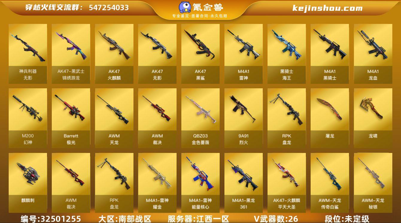江西一区-26V-0王者武器数-0炫金武器数 【热门武器】:QBZ03-金色蔷薇,M200-幻神,死亡之眼,M4A1-黑骑士,RPK-盘龙*2 【皮肤】:雷神-能量核心,雷神-耀金皮肤,火麒麟-平天大圣,火麒麟-心动糖果,M4A1-黑龙-361,天龙-秘银,AWM-天龙-传奇白鲨 【角色】:暗夜-X,飞虎队-X,风暴女,嘉年华灵狐,灵狐-花神,灵狐者-黄金海岸,龙儿-小淘气,潘多拉-X,邱刚敖,斯沃特-X,蜀雪,铁骑-乘风破浪,铁骑荣耀,影武者-X,职业选手 【人偶武器】:AWM-灵狐-15周年嘉年华 【暴走生化】:死亡之眼 【挑战大师】:AK47-冰龙粉碎者,神圣爆裂者-末日III 【英雄级武器】:AK47-火麒麟,M4A1-雷神,M4A1-黑骑士,AK47-无影,AK47-黑鲨,M4A1-龙血*2,无影-神兵利器,黑武士-锦绣游龙,QBZ03-金色蔷薇,9A91-烈火,黑骑士-海王,AWM-天龙,Barrett-极光,AWM-裁决*2,M200-幻神,RPK-盘龙*2,屠龙,龙啸,麒麟刺,尼泊尔-雷霆,高爆手雷-雷霆,闪光弹-雷霆,烟雾弹-雷霆 【源级武器】:源-千变*2,源·火麒麟*2,御·黑龙-龙太子,源·雷神*2,魂·雷神-15周年嘉年华,M4A1-十二生肖·龙-雷神,雷神-赛博朋克,御·雷神-葫芦兄弟,御·雷神-小白龙,御·黑骑士·哪吒闹海*2,源·青龙*2,魂·QBZ03-...