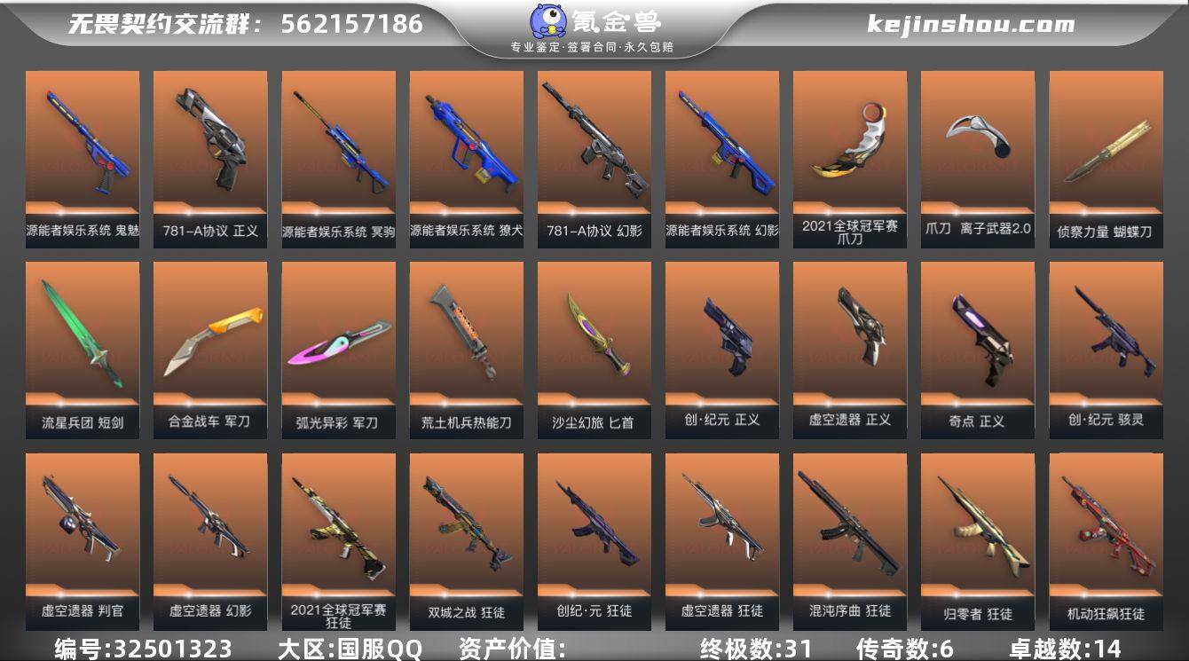 【套装】:2021全球冠军赛套装,源能者娱乐系统套装,虚空遗器套装,创·纪元套装,离子武器//2.0套装,盖世英雄套装,无畏启程套装 【英雄】:幻棱,炼狱,维斯,暮蝶,钛狐,壹决,铁臂,捷风,雷兹,幽影,不死鸟,贤者,猎枭,蝰蛇,零,芮娜,奇乐,尚勃勒,霓虹,斯凯,夜露,星礈,K/O,海神,盖可,黑梦,钢锁 【近战武器】:近战武器-2021全球冠军赛 爪刀,近战武器-侦察力量 蝴蝶刀,近战武器-剥皮小刀,近战武器-镭切,近战武器-鬼丸国纲,近战武器-离子武器//2.0 爪刀,近战武器-源始幻刃,近战武器-流星兵团 短剑,近战武器-定海神珍,近战武器-合金战车 军刀,近战武器-弧光异彩 军刀,近战武器-荒土机兵 热能刀,近战武器-街机高手,近战武器-沙尘幻旅 匕首,近战武器-天玄刀 【狂徒】:狂徒-2021全球冠军赛,狂徒-归零者,狂徒-混沌序曲,狂徒-机动狂飙,狂徒-双城之战,狂徒-塑水宗,狂徒-创·纪元,狂徒-虚空遗器,狂徒-盖世英雄,狂徒-盖亚的复仇,狂徒-紫阙金琅,狂徒-离子武器//2.0,狂徒-赤焰铁骥,狂徒-弧光异彩,狂徒-荒土机兵,狂徒-流星兵团,狂徒-沙尘幻旅 【幻影】:幻影-虚空遗器,幻影-781-A协议,幻影-源能者娱乐系统,幻影-合金战车,幻影-噬源...