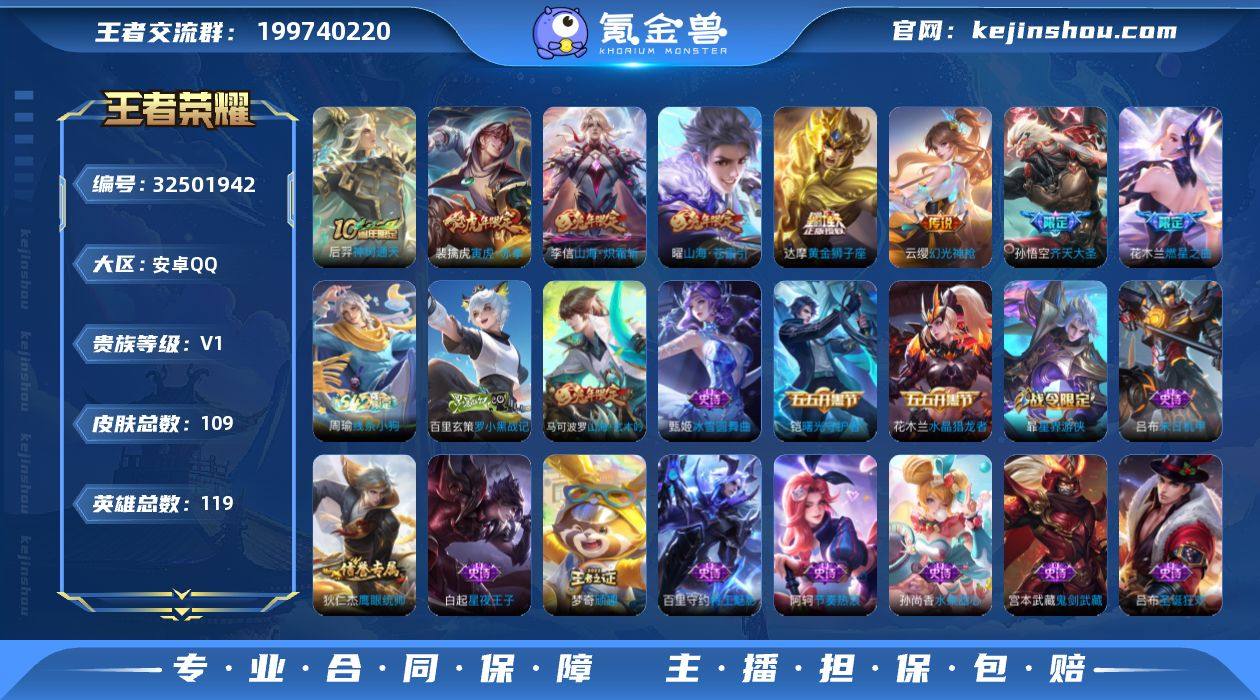 【BL精氪号男神号边路号打野号·109皮8质量传说4按键·寅虎赤拳·山海炽霜斩可二次秒换绑】 安卓Q-V0-最强王者段位-119英雄-109皮肤-8传说-23史诗 【传说皮肤】:后羿神树通天,云缨幻光神枪,花木兰燃星之曲,孙悟空齐天大圣,曜山海苍雷引,李信山海炽霜斩,裴擒虎寅虎赤拳,达摩黄金狮子座 【限定皮肤】:姜子牙天穹之誓,狄仁杰阴阳师,赵云皇家上将,高渐离玩趣恶龙,甄姬落雪兰心,马可波罗山海玄木吟,狄仁杰魔术师,项羽海滩派对,花木兰燃星之曲,孙悟空齐天大圣,李元芳云中旅人,钟馗驱傩正仪,苏烈千军破阵,梦奇顽趣,沈梦溪大漠名商,裴擒虎寅虎赤拳,裴擒虎擒涛扼浪,李信山海炽霜斩,嫦娥暖冬兔眠,曜山海苍雷引,鲁班大师探海日志,桑启海盐诗旅,暃星界游侠,张良古海寻踪,鬼谷子天穹祈灯,沈梦溪龙舞盛年,刘邦剑破天穹,程咬金群星魔术团,周瑜熔金海岸 【年限皮肤】:裴擒虎寅虎赤拳,曜山海苍雷引,李信山海炽霜斩,马可波罗山海玄木吟 【赛季限定】:钟馗驱傩正仪,苏烈千军破阵,沈梦溪大漠名商,李元芳云中旅人,桑启海盐诗旅,裴擒虎擒涛扼浪,鲁班大师探海日志,张良古海寻踪,鬼谷子天穹祈灯,刘邦剑破天穹,姜子牙天穹之誓,亚瑟荣光之誓,梦奇顽...