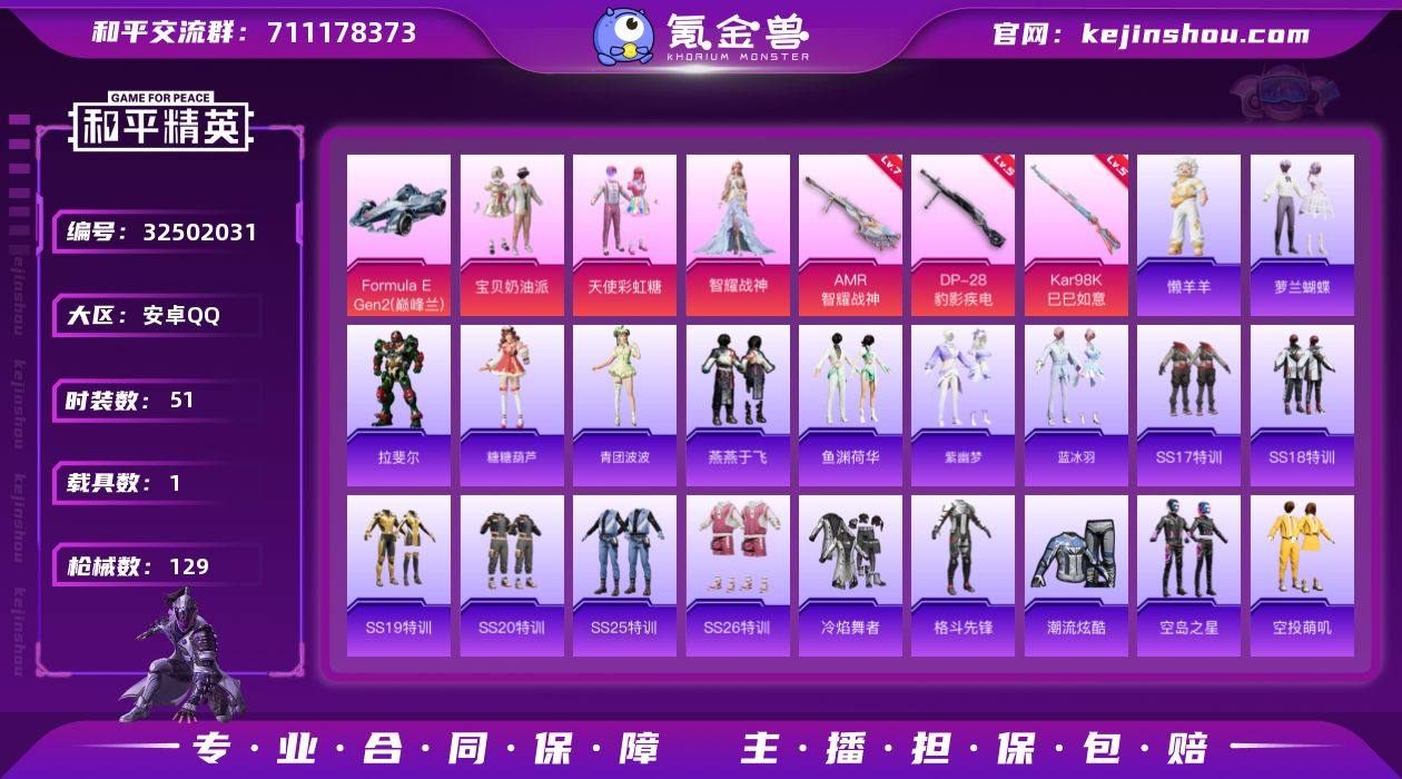 【kyhp10】安卓 手Q-3粉装-3特效枪-1载具-0粉色飞行器-33441热力值-1王牌印记-51套装-129枪皮 【粉色套装】:粉装-宝贝奶油派,粉装-天使彩虹糖,角色-智耀战神 【粉色枪皮等级】:Kar98K-巳巳如意(五级),AMR-智耀战神(七级),DP-28-豹影疾电(五级) 【粉色载具】:Formula E Gen2(巅峰兰) 【粉色枪皮】:Kar98K-巳巳如意,AMR-智耀战神,DP-28-豹影疾电 【粉色降落伞】:甜心宝贝降落伞,洛神天依降落伞,超新星降落伞,圣堂之誓降落伞,精灵梦叶罗丽降落伞,未来领航者降落伞,临安公主降落伞,星穹咏叹调降落伞 【稀有套装】:套装-萝兰蝴蝶,角色-拉斐尔,套装-糖糖葫芦,套装-青团波波,套装-燕燕于飞,套装-鱼渊荷华,套装-紫幽梦,套装-蓝冰羽,玩偶服-懒羊羊 【稀有枪皮】:AKM-彩虹符号,AKM-破晓战魂,AKM-萌趣颜团子,AKM-虎虎生威,AKM-龙的传人,M16A4-甜心亚梦,M16A4-红色方程式,M16A4-蓝色火焰,SCAR-L-玉兔迎春,SCAR-L-红色方程式,M416-红色方程式,M416-蓝色火焰,GROZA-异彩先驱,AUG-天降萌叽,AUG-耀粉歌者,QBZ-飞驰魅影,M762-瑞龙福将,M762-甜心宝贝,Mk47-妙红点点,Mk47-炫光之旅,AC-VAL-甜心亚梦,蜜獾-娇憨猪猪,UZI-啾咪啾咪,UZI-娇憨猪...