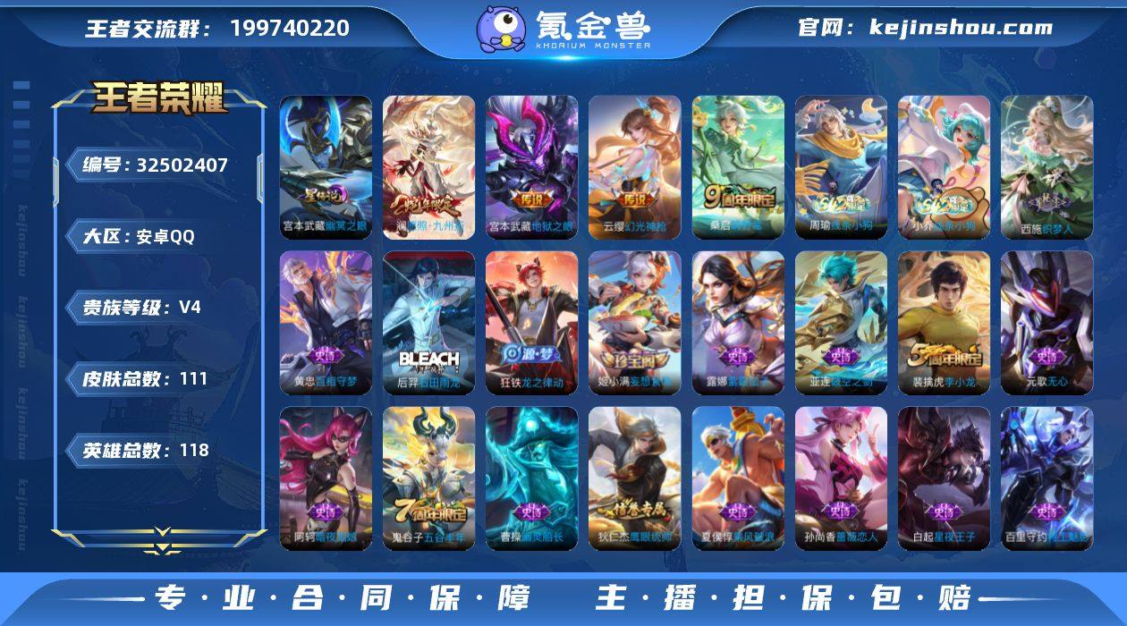 【WZ181542】安卓Q-V4-至尊星耀I段位-118英雄-111皮肤-4传说-30史诗【英雄全皮】:敖隐全皮【传说皮肤】:澜愿照九州拓,云缨幻光神枪,桑启鸣野蒿,宫本武藏地狱之眼【限定皮肤】:姜子牙天穹之誓,狄仁杰阴阳师,孙尚香蔷薇恋人,元歌无心,项羽海滩派对,兰陵王金庭之子,李元芳云中旅人,鬼谷子五谷丰年,沈梦溪大漠名商,裴擒虎李小龙,裴擒虎擒涛扼浪,鲁班大师探海日志,桑启海盐诗旅,张良古海寻踪,鬼谷子天穹祈灯,姬小满妄想食味,沈梦溪龙舞盛年,周瑜熔金海岸【年限皮肤】:澜愿照九州拓【赛季限定】:兰陵王金庭之子,沈梦溪大漠名商,李元芳云中旅人,桑启海盐诗旅,裴擒虎擒涛扼浪,鲁班大师探海日志,张良古海寻踪,鬼谷子天穹祈灯,姜子牙天穹之誓,东皇太一噬灭天穹,太乙真人谧流熔炉【战令限定】:亚连破空之剑,周瑜线条小狗,小乔线条小狗【史诗皮肤】:周瑜线条小狗,小乔线条小狗,百里玄策罗小黑战记,西施织梦人,黄忠百相守梦,后羿石田雨龙,狂铁龙之律动,亚连破空之剑,姬小满妄想食味,元歌无心,鬼谷子五谷丰年,裴擒虎李小龙,狄仁杰鹰眼统帅,白起星夜王子,李元芳逐浪之夏,百里守约特工魅影,兰陵王暗隐猎兽者,夏侯惇乘风破浪,曹操幽...
