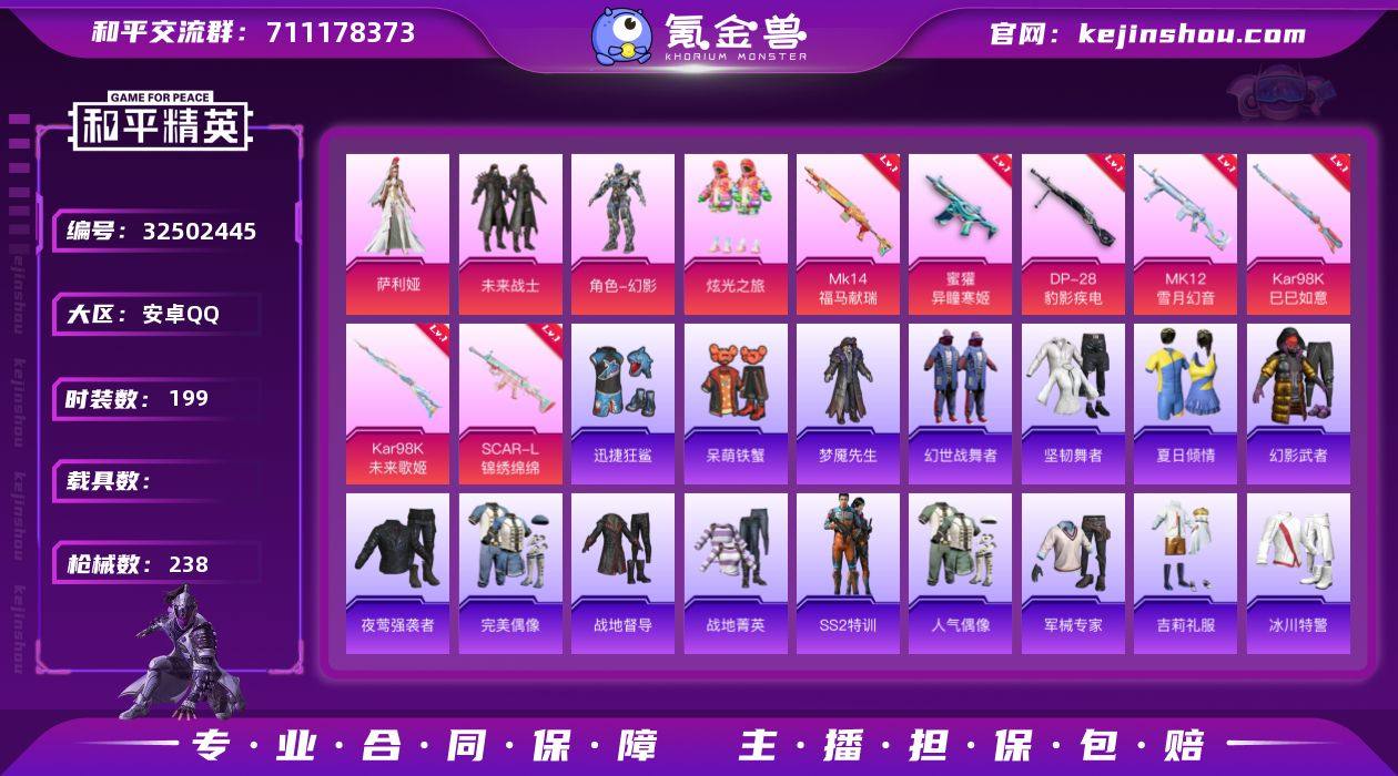 【4粉装7特效枪 可秒换绑不用等】 安卓Q区-68079热力值-199套装-238枪皮 【1稀有】 AWM-黄金龙骨【4粉装】 炫光之旅 鸢尾珑雾 未来战士 角色-萨利娅【7特效枪】 SCAR-L-锦绣绵绵(5级) Kar98K-未来歌姬(5级) Mk14-福马献瑞(5级) MK12-雪月幻音(6级) Kar98K-巳巳如意(5级) DP-28-豹影疾电(5级) 蜜獾-异瞳寒姬(7级)【29热门】 M416-蓝色火焰 M762-快乐主宰 长空猛禽 牛气冲天 霓虹街区 S686-奇异狩猎者 风暴特警 浪漫天命 梦魇先生 破蛋小黄鸡 迅捷狂鲨 暗影哥特(红眼罩) 极速红龙 白色伏地魔 SS27特训 SS26特训 SS25特训 SS24特训 SS22特训 AKM-缤纷海域 SCAR-L-玉兔迎春 M762-彩虹符号 Mk47-乌木金纹 UMP45-蓝色火焰 DBS-彩虹符号 M249-彩虹符号 AKM-霓虹街区 呆萌铁蟹【5飞行器】 天之羽翼飞行器 空岛之星尾迹 炫彩糖果飞行器 冠军兔兔飞行器 英伦信使飞行器 营地ID:923271532