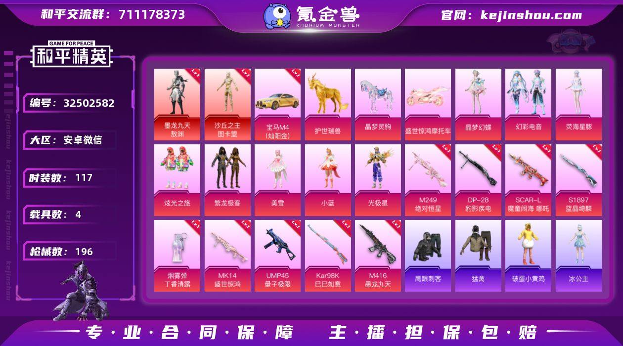 2红装 9粉装 10粉枪 4载具 117套装 196枪皮 8热门 宝马M4(灿阳金) 护世瑞兽 晶梦灵驹 盛世惊鸿摩托车 沙丘之主-图卡盟 墨龙九天-敖渊 炫光之旅 繁龙极客 幻羽潜行 黄色名流 猛禽 王牌教练 青玉碎影 龟仙人 竞技名士 光之冒险 冰冻风暴 完美偶像 街头潮人 旭日情侣 缤纷果语 幻世战舞者 角色-光极星 角色-小蓝 角色-美雪 角色-荧海星豚 角色-晶梦幻蝶 幻彩电音 M416-墨龙九天(6级) Mk14-盛世惊鸿(3级) M249-绝对恒星(2级) GROZA-影袭 汤姆逊-炫彩节奏 Kar98K-影袭 DBS-焰鹰斗篷 DP-28-焰鹰斗篷 M416-红色方程式 AUG-耀粉歌者 M24-影袭 Mk47-炫光之旅 M249-糯团青竹 蜜獾-天降萌叽 GROZA-生命誓言 AUG-天降萌叽 S12K-夜灯 AA12-G-炫光之旅 UMP45-夜灯 S1897-百万伏特 UZI-影袭 AWM-焰鹰斗篷 Vector-焰鹰斗篷 MP5K-乌木金纹 UZI-天降萌叽 SCAR-L-炫彩节奏 M16A4-幻世战舞者 S686-彩虹符号 S1897-蓝晶绮麟(4级) Kar98K-巳巳如意(5级) DP-28-豹影疾电(5级) 烟雾弹-丁香清露(5级) SCAR-L-魔童闹海 哪吒 UMP45-量子极限(5级) 冰公主 SS27特训 UMP45-炫光之旅 DBS-彩虹符号 M249-彩虹符号 鹰眼刺客 破蛋小黄鸡 长空猛禽 极意拳锋飞行器 终晖之翼飞行器 龙翔九天飞行器 水晶纸鸢飞行器...