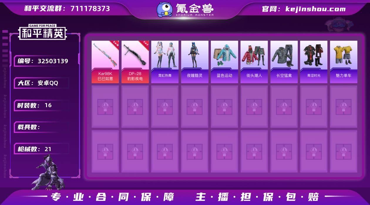 【特价出售/店主推荐】安卓 手Q-2特效枪-5019热力值-16套装-21枪皮【粉色枪皮等级】:Kar98K-巳巳如意(四级),DP-28-豹影疾电(一级)