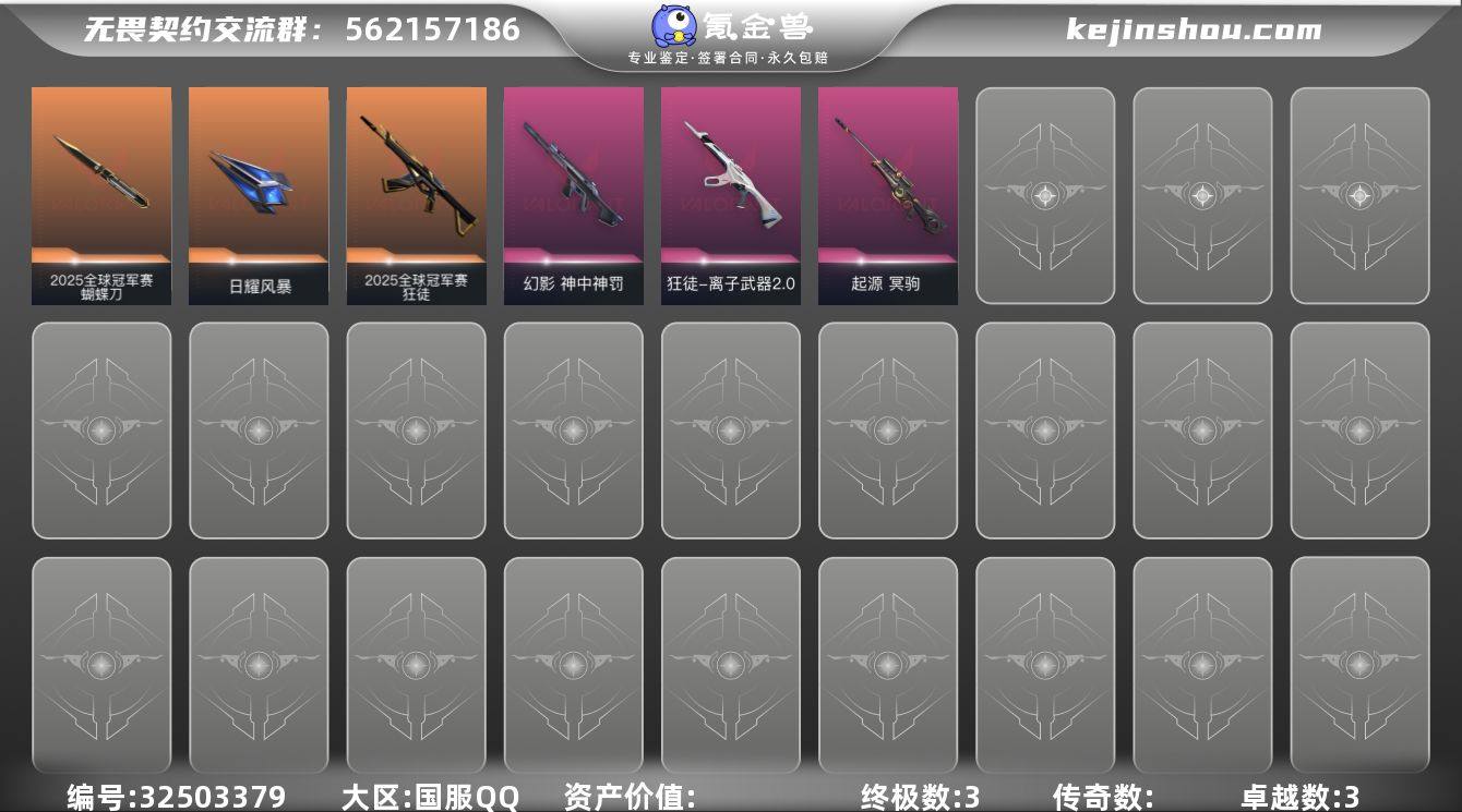 【937898】【套装】:2025全球冠军赛套装 【英雄】:幻棱,炼狱,暮蝶,钛狐,壹决,铁臂,捷风,雷兹,幽影,不死鸟,贤者,猎枭,零,芮娜,尚勃勒,霓虹,斯凯,夜露,K/O,海神,盖可 【近战武器】:近战武器-2025全球冠军赛 蝴蝶刀,近战武器-日耀风暴 遗器 【狂徒】:狂徒-2025全球冠军赛,狂徒-离子武器//2.0 【幻影】:幻影-神中神罚 【冥驹】:冥驹-起源 【骇灵】:骇灵-无限竞技 【卡面】:树懒大作战 卡面,红鳞松叶 卡面,Clutch 卡面,无畏契约GO!第一卷:芮娜 卡面,无畏契约GO!第一卷:零 卡面,比比看谁快? 卡面,无垠星环 卡面,《双城之战》金克丝 卡面,代号红色 卡面,新兵报到 卡面,V契约 卡面,无畏契约 卡面 【喷漆】:伤心心 喷漆,致命优雅 喷漆,买装还是存钱 喷漆,关门放狗 喷漆,无畏契约GO!第一卷:贤者 喷漆,松叶 喷漆,放下武器 喷漆,胜利属于无畏契约 喷漆,GLHF 喷漆,无畏契约 喷漆 【挂饰】:动力机箱 挂饰,天外飞客 挂饰,《双城之战》魄罗 挂饰,无畏契约 纪念币 挂饰