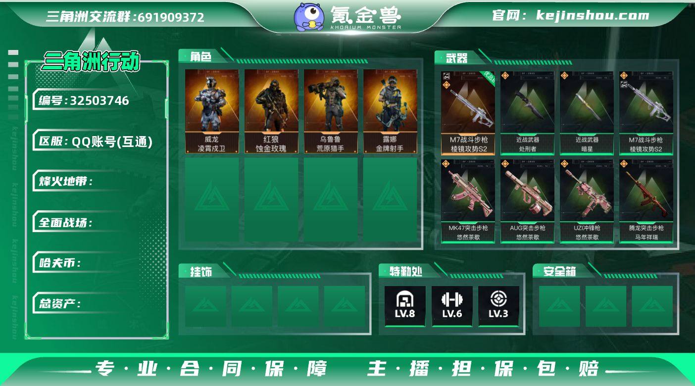 YQ-总资产129.5m/哈夫币35.294m/部门22311/点券1178(包含三角币888) 【高物资纯币2红2刀 1典藏物资皮肤号 优品B淡紫M7棱镜 蚀金玫瑰/凌霄戍卫/悠然茶歇/锦绣/缄花/暗星套 满级处刑者 训中6级 靶场3级 仓库8级 露娜-运动员 S8赛季3x3已开 天才少年 S8巅峰战神 55*AWM 】 等级 60 烽火段位 三角洲巅峰 橙:UZI悠然茶歇,AUG悠然茶歇,MK47悠然茶歇,QBZ凌霄戍卫,AKM锦绣,K437锦绣,SMG锦绣,AWM万金泪冠,腾龙万金泪冠,勇士万金泪冠,M14缄花,SR缄花,.357缄花,腾龙马年祥瑞,G18马年祥瑞,M7棱镜,K416行动记录,M4A1蚀金玫瑰,MK47暗星,SR暗星,M14蛮荒,SG552运动员, 刀:近战处刑者,近战暗星 限时道具/段位以实际验号为准。如账号因没有维护,赛季更新等不可抗因素发生变化,不属于账号质量问题差""