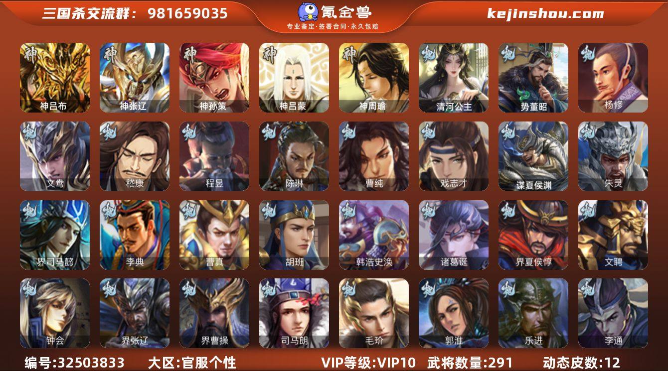 VIP等级: VIP10 官阶: 骠骑将军 武将数量: 291 动态皮肤数量: 12 神将: 神吕布,神孙策,神张辽,神吕蒙,神周瑜 魏国武将: 戏志才,曹纯,陈琳,程昱,嵇康,文鸯,杨修,张辽,SP蔡文姬,SP关羽,SP姜维,卞夫人,蔡贞姬,曹昂,曹操,曹冲,曹洪,曹丕,曹仁,曹叡,王异,鲁芝,界曹植,满宠,荀攸,王基,钟繇,郭嘉,荀彧,杜畿,崔琰,界荀彧,朱灵,界甄姬,吕虔,界王异,界许褚,界郭淮,华歆,陈群,界曹休,谋甄姬,司马孚,袁涣,李通,乐进,郭淮,毛玠,夏侯惇,曹植,司马朗,界曹操,许褚,界张辽,谋徐晃,张郃,钟会,文聘,曹彰,界夏侯惇,诸葛诞,司马懿,甄姬,徐晃,韩浩史涣,胡班,曹真,典韦,夏侯渊,李典,于禁,邓艾,界司马懿,朱灵(国战),清河公主,势董昭,谋夏侯渊 蜀国武将: 谯周,沙摩柯,赵襄,诸葛瞻,谋赵云,徐庶,界魏延,杨仪,吕凯,界关羽,界诸葛亮,邓芝,界伊籍,费祎,严颜,界张嶷,赵云,张松,李丰,界刘备,刘封,糜竺,谋庞统,黄月英,关羽,王甫赵累,吴懿,吴班,界廖化,祝融,张飞,黄皓,魏延,界法正,刘禅,张翼,关银屏,SP孙尚香,SP徐庶,卧龙诸葛,周仓,简雍,界关兴张苞,诸葛亮,界张飞,界卧龙诸葛,法正,界简雍,界马岱,关平,马岱,界庞统,庞统,诸葛果,马谡,马超,霍峻,廖化,关兴张苞,孟获,秦宓,吴苋,夏侯氏,姜维,黄忠,刘备,界马超,李严,...