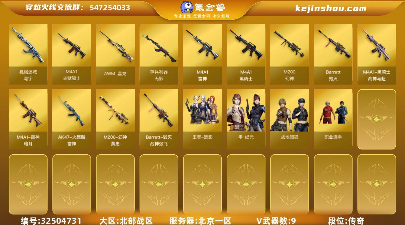 【ky6349】北京一区-10V-0王者武器数-0炫金武器数 【热门武器】:M200-幻神,M4A1-黑骑士 【音效卡】:Barrett-毁灭音效卡,AWM-昌龙-怀旧音效卡 【皮肤】:M200-幻神-黄忠皮肤,雷神-暗月,雷神-源计划2.0专属 皮肤,雷神-化蛇 皮肤,火麒麟-雷神,毁灭-战神张飞,黑骑士-战神马超 【角色】:零·纪元,战地猎狐,王者-魅影,乔伊教练,修道士,暗夜-X,芳心审判者,嘉年华灵狐,灵狐者-X,灵狐者-七夕宝贝,麻雀,曼陀罗-X,潘多拉-X,蜀雪,职业选手,潘多拉-N 【人偶武器】:AWM-灵狐-15周年嘉年华,迷你波特博士 【挑战大师】:冰龙粉碎者-白马银枪,神圣爆裂者-末日III 【英雄级武器】:M4A1-雷神,M4A1-黑骑士,无影-神兵利器,机械迷城-穹宇,Barrett-毁灭*2,M200-幻神,屠龙-斗烈龙驹,M4A1-赤狱骑士,AWM-昌龙 【源级武器】:御·火麒麟-平天大圣,火麒麟-雷神,魂·M4A1-雷神-化蛇,魂·雷神-诺拉,魂·雷神-神秘按键,魂·雷神-新春神龙,魂·雷神-15周年嘉年华,御·雷神-烈虎*2,M4A1-十二生肖·龙-雷神,源·黑骑士,魂·黑骑士-现代金属*2,魂·黑骑士-幻能朋克*2,魂·黑骑士-破浪10年,御·黑骑士·哪吒闹海,魂-死神-机甲核心,魂·黑武士-锋芒破茧,魂·超新星-春桃,源·...