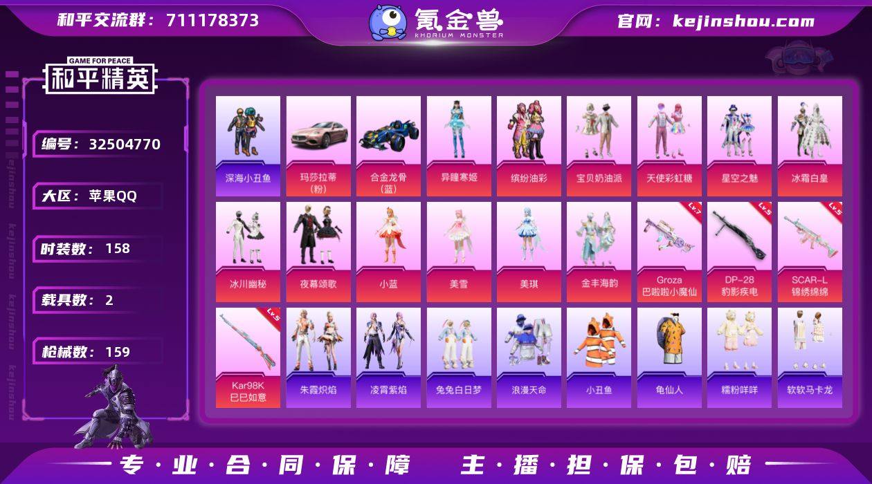 YZJ16001-可二次-苹果Q-1稀有2载具12粉装5特效枪14热门【精品公主号 多款优质热门粉装副套 猪妹 美雪 美琪 小蓝 甜心两姐妹 星空之魅 夜幕颂歌 权威小番茄 纯白跃动 糯粉咩咩 软软马卡龙 兔兔白日梦 梦幻奶油 绒宝小鹅 晶辉守护 黄油吐司 卖崽青蛙 灵公主 小丑鱼 双马尾 天命 满级狗砸巴啦啦小魔仙 巴啦啦小魔仙背包头盔 网红伙伴-美月兔 4款飞行器】158套装159枪皮 55376热力值 7印记 历史超级王牌9星 【1稀有】 浪漫天命 【2载具】 玛莎拉蒂粉色 合金龙骨蓝色 【12粉装】 小蓝 美琪 美雪 宝贝奶油派 天使彩虹糖 夜幕颂歌 金丰海韵 异瞳寒姬 缤纷油彩 星空之魅 冰川幽秘 冰霜白皇 【5特效枪】 SCAR-L-锦绣绵绵 (5级) Kar98K-巳巳如意 (5级) DP-28-豹影疾电 (5级) GROZA-巴啦啦小魔仙 (7级) Mk14-福马献瑞 (4级) 【14热门】 小丑鱼 龟仙人 红熊茄茄 软软马卡龙 晶辉守护 糯粉咩咩 兔兔白日梦 深海小丑鱼 团圆交子 瑞龙福将 破蛋小黄鸡 极速红龙 弄潮海豚 M762-瑞龙福将 【1飞行器】 童趣迷兔飞行器 【3头盔】 童趣迷兔头盔 甜心宝贝头盔 深海小丑鱼头盔 【1背包】 甜心宝贝背包 营地ID:788950635