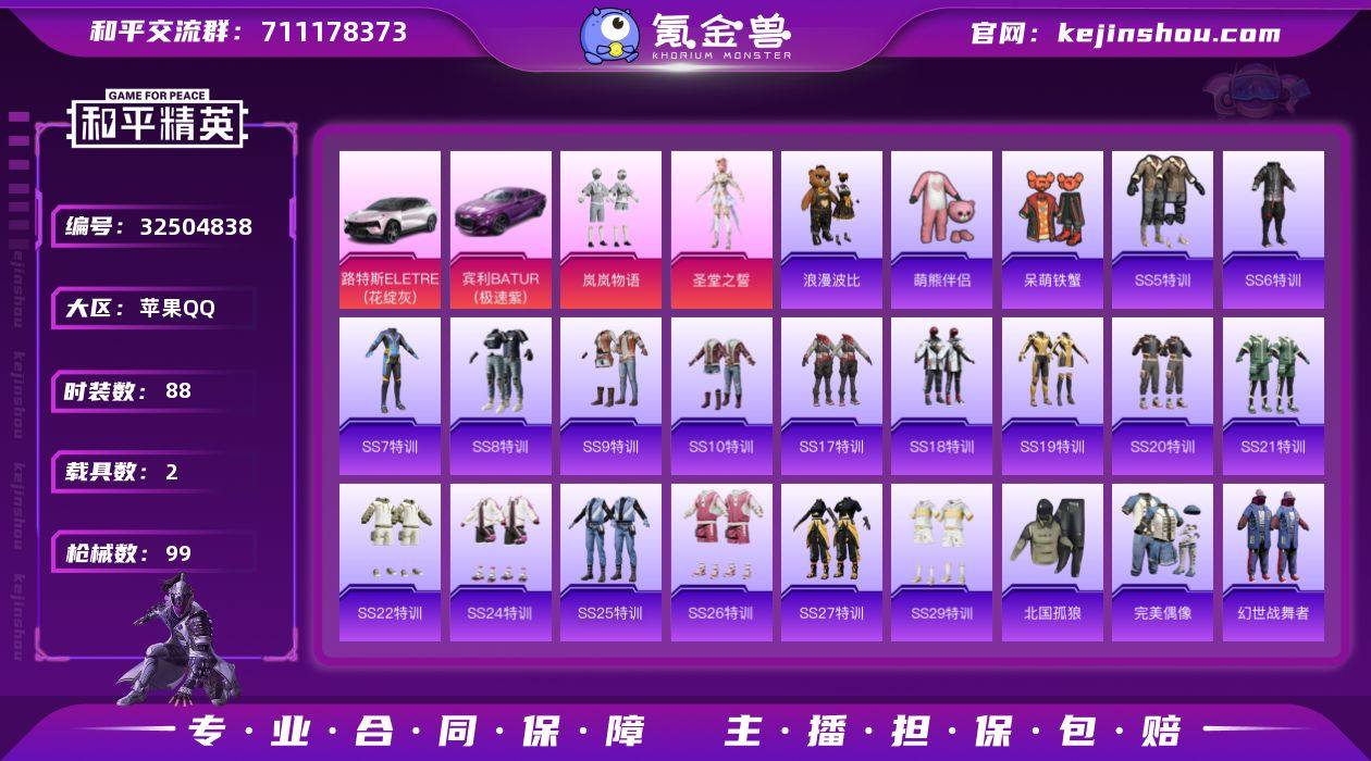 苹果 手Q-2粉装-1特效枪-2载具-0粉色飞行器-37535热力值-11王牌印记-88套装-99枪皮【热门品类】:套装-浪漫波比,套装-萌熊伴侣【粉色套装】:粉装-岚岚物语,角色-圣堂之誓【粉色枪皮等级】:UMP45-萌骑冒险(五级)【粉色载具】:路特斯ELETRE(花绽灰),宾利BATUR(极速紫)【粉色枪皮】:UMP45-萌骑冒险【粉色降落伞】:海渊国主降落伞,垂柳戏鸭降落伞,太空嘟嘟降落伞,彩虹甜喵降落伞,炫光之旅降落伞,猪猪侠降落伞【稀有枪皮】:AKM-彩虹符号,AKM-环太平洋,AKM-虎虎生威,AKM-霓虹街区,M16A4-幻世战舞者,M16A4-甜心亚梦,SCAR-L-炫彩节奏,SCAR-L-玉兔迎春,SCAR-L-红色方程式,M416-摩登王国,M416-月影鸳鸯,M416-糯团青竹,M416-红色方程式,M416-蓝色火焰,GROZA-异彩先驱,AUG-耀粉歌者,QBZ-彩虹符号,QBZ-飞驰魅影,M762-瑞龙福将,AC-VAL-天降萌叽,AC-VAL-快闪甜心,AC-VAL-甜心亚梦,蜜獾-千面幻镜,蜜獾-天降萌叽,蜜獾-娇憨猪猪,UZI-啾咪啾咪,UZI-娇憨猪猪,UMP45-生命誓言,UMP45-诡娃娃,汤姆逊-异彩先驱,汤姆逊-炫彩节奏,汤姆逊-环太平洋,MP5K-异彩先驱,P90-快闪甜心,P90-飞驰魅影,Kar98K-彩虹符号,Kar98K-炫彩节奏,Kar98K-红色方程式,...