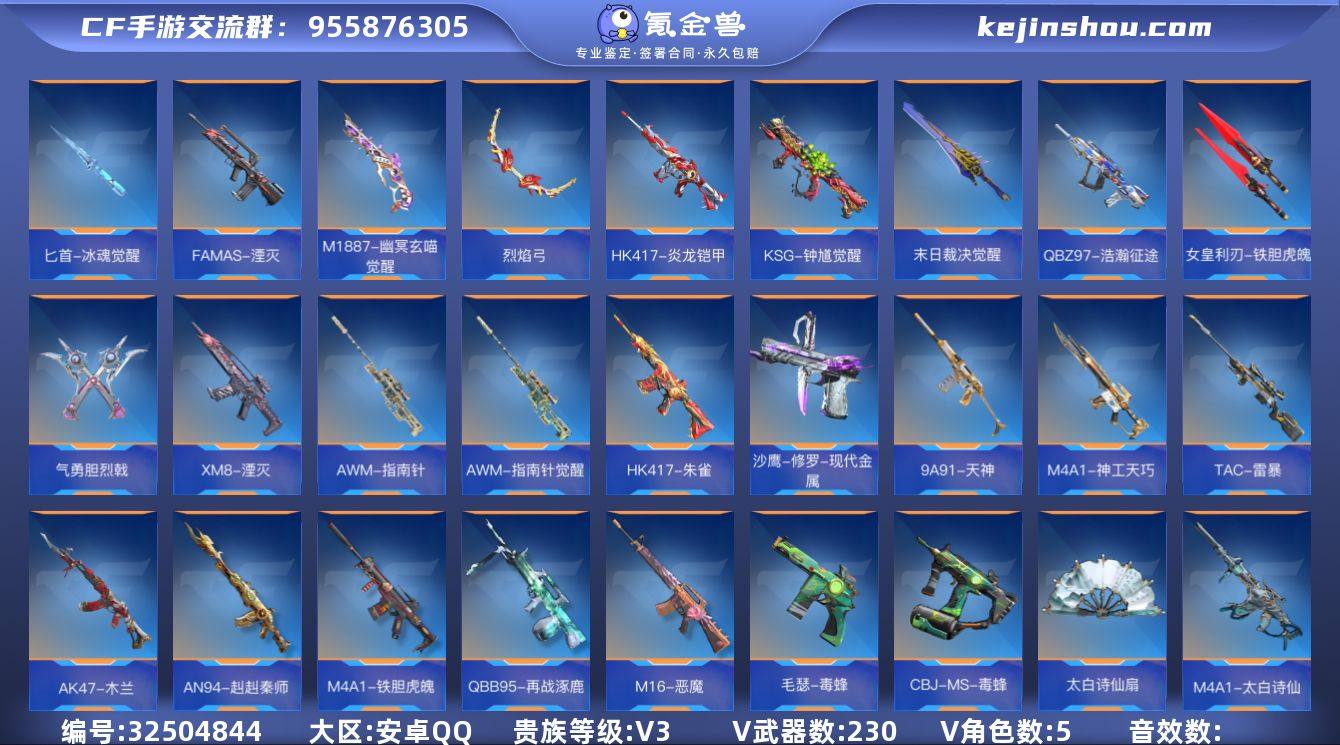 可二次【230V M200幻神 V3 王者之尊 王者之誉 王者之霆】【等级】94【区服】手Q-安卓【金角色数】5【金武器数】230【金V角色】关小雨 审判者 炽天使-X 零-新生 祝融夫人 复仇者【金V武器】刘易斯-天使 5-极光 9A91-天神 AK47-血武士 AN94-四凶觉醒 M4A1-雷神 CZS2-心动次元 QCW05-变形金刚·大黄蜂 秋逸觉醒 马来剑-毁灭 唐刀-大唐荣耀 麒麟刺 QBB95-极光 巴雷特-冬灭 沙鹰-修罗 加特林-堡垒 巴雷特-毁灭 PP19野牛-造纸术 47-鼓龙 USP-神罚 USP-神罚 马来剑-毁灭 M4A1-死神 龙鳞-觉醒 QBZ03-死神 巴雷特-毁灭 打击者-天神 AWM-裁决 神罚战斧 QBZ03-玉面羞花 98K-黑骑士 黑骑士烟雾弹 黑骑士手雷 QCW05-变形金刚·大黄蜂 手斧-机械迷城 屠龙 气手枪-血月 QBZ03-金色蔷薇 SCAR-印刷术 擎天觉醒 汤姆逊-烈龙 汤姆逊-烈龙 血月 SCAR Light-白虎 USP-机械迷城 双持斯泰尔-天使 M4A1-心动次元 M4A1-猎神 09式狙-天神 AK47-火麒麟 M4A1-太白诗仙 太白诗仙扇 嗜血金鲨 CBJ-MS-毒蜂 加特林-堡垒 AK47-火麒麟 地狱烈炎 AA12-火药 M16-恶魔 QBB95-再战涿鹿 AN94-赳赳秦师 AWM-指南针 HK417-朱雀 M4A1-冰锋觉醒 TAC-晴舞 尼泊尔-机械纪元 AWM-指南针觉醒 巴雷特-毁灭 激昂霸王枪 闪光弹-神工...