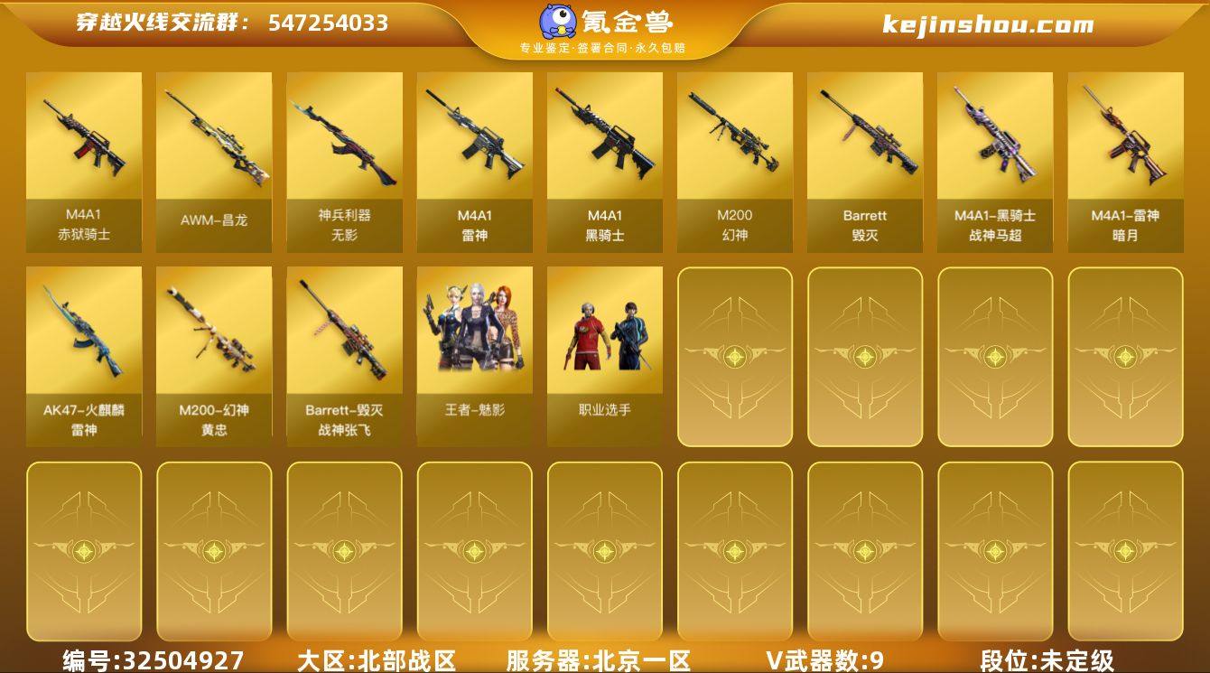 北京一区-10V-0王者武器数-0炫金武器数 【热门武器】:M200-幻神,M4A1-黑骑士 【音效卡】:Barrett-毁灭音效卡,AWM-昌龙-怀旧音效卡 【皮肤】:M200-幻神-黄忠皮肤,雷神-暗月,雷神-源计划2.0专属 皮肤,雷神-化蛇 皮肤,火麒麟-雷神,毁灭-战神张飞,黑骑士-战神马超 【角色】:零·纪元,战地猎狐,王者-魅影,乔伊教练,修道士,暗夜-X,芳心审判者,嘉年华灵狐,灵狐者-X,灵狐者-七夕宝贝,麻雀,曼陀罗-X,潘多拉-X,蜀雪,职业选手,潘多拉-N 【人偶武器】:AWM-灵狐-15周年嘉年华,迷你波特博士 【挑战大师】:冰龙粉碎者-白马银枪,神圣爆裂者-末日III 【英雄级武器】:M4A1-雷神,M4A1-黑骑士,无影-神兵利器,机械迷城-穹宇,Barrett-毁灭*2,M200-幻神,屠龙-斗烈龙驹,M4A1-赤狱骑士,AWM-昌龙 【源级武器】:御·火麒麟-平天大圣,火麒麟-雷神,魂·M4A1-雷神-化蛇,魂·雷神-诺拉,魂·雷神-神秘按键,魂·雷神-新春神龙,魂·雷神-15周年嘉年华,御·雷神-烈虎*2,M4A1-十二生肖·龙-雷神,源·黑骑士,魂·黑骑士-现代金属*2,魂·黑骑士-幻能朋克*2,魂·黑骑士-破浪10年,御·黑骑士·哪吒闹海,魂-死神-机甲核心,魂·黑武士-锋芒破茧,魂·超新星-春桃,源·武圣*3,源·...