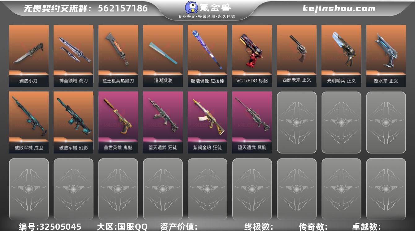 MWW606【28英雄 91皮肤 资产38140 VCT25爪刀 奇点2.0蝴蝶刀 剥皮小刀 澄湖潋滟 紫金狂徒 塑水宗狂徒 洪荒狂徒】【游戏等级】Lv152 【段位】 未定级 【R点】1,280 【皮肤总价值】38,140 【英雄数量】28 【皮肤数量】91 【挂饰数量】99 【卡面数量】135 【喷漆数量】120 【狂怒】狂怒-蒙太奇 狂怒-万花棱镜 狂怒-神圣领域 狂怒-逆冲蛮牛 狂怒-聚合之力 狂怒-战术熊与伙伴们 【狂徒】狂徒-紫阙金琅 狂徒-海洋之星 狂徒-荒土机兵 狂徒-双城之战 狂徒-盖亚的复仇 狂徒-洪荒怒焰 狂徒-堕天遗武 狂徒-超能偶像 狂徒-流星兵团 狂徒-塑水宗 【标配】标配-阿特拉斯指挥部 标配-荒土机兵 标配-浮光跃金 标配-VCTxEDG 标配-超能偶像 标配-战术熊与伙伴们 【近战武器】近战武器-神圣领域战刀 近战武器-VCT2025爪刀 近战武器-荒土机兵热能刀 近战武器-奇点//2.0蝴蝶刀 近战武器-超限闪存匕首 近战武器-剥皮小刀 近战武器-超能偶像应援棒 近战武器-澄湖潋滟 近战武器-流星兵团短剑 【鬼魅】鬼魅-星云暗涌 鬼魅-模拟赫兹 鬼魅-采蜜小蜂队 鬼魅-盖世英雄 鬼魅-扑棱扑棱 鬼魅-流星兵团 【冥驹】冥驹-星云暗涌 冥驹-荒土机兵 冥驹-模拟赫兹 冥驹-堕天遗武 【戍卫】戍卫-月球哨兵 戍卫-破败军械...