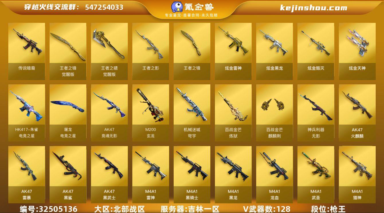 MCF893【128V 传说暗裔 6王者】无二次包 【等级】100【区服】吉林一区【英雄角色】3【英雄武器】128【传说级武器】传说暗裔【王者级武器】 王者之啸-觉醒版 炼狱-悦蓝-觉醒版 王者之锋-觉醒版 王者之锋 王者之锋 王者之影 【炫金级武器】炫金黑龙 炫金武士 炫金毁灭 炫金毁灭 炫金天神 炫金雷神 【音效卡】 HK417-朱雀-电竞之星-竞星跃动音效卡 屠龙-电竞之星-竞星跃动音效卡 炼狱-百战金芒-庆典舞曲音效卡 屠龙-动感闪耀 音效卡 Barrett-极光音效卡 Barrett-极光音效卡 M4A1-黑骑士音效卡【枪械皮肤】火麒麟-百城 毁灭-黑大圣皮肤 毁灭-战神张飞 无影耀金皮肤 黑骑士耀金皮肤 火麒麟-华夏之心 毁灭耀金皮肤 黑武士-典韦皮肤 AWM-天龙-传奇70KG 雷神-能量核心 雷神-能量核心 雷神-能量核心 修罗耀金皮肤 雷神-能量核心 雷神-虎将 无影耀金皮肤 雷神-虎将 极光-能量核心 黑骑士耀金皮肤 雷神-星空 【英雄级角色】魅影 春 幻面灵狐 葵-阿尔法武装【英雄级武器】屠龙-斗烈龙驹 HK417-朱雀-电竞之星 屠龙-电竞之星 炼狱-百战金芒 机械迷城-穹宇 麒麟刺-百战金芒 M4A1-再燃火线 龙啸-烈火龙威 烈火-动感闪耀 屠龙-动感闪耀 天神-动感闪耀 手雷-动感闪耀 沙鹰-修罗 沙鹰-修罗 无影-...