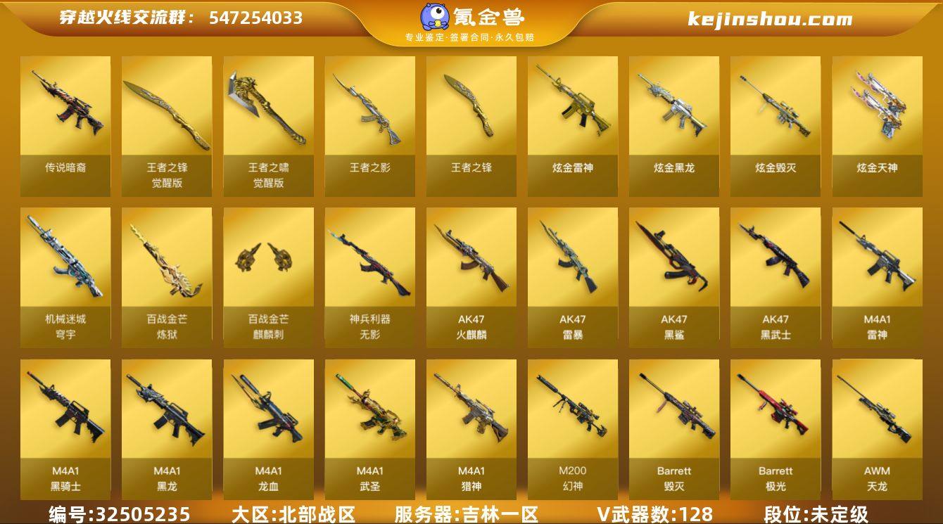 MCF893【128V 传说暗裔 6王者】无二次包 【等级】100【区服】吉林一区【英雄角色】3【英雄武器】128【传说级武器】传说暗裔【王者级武器】 王者之啸-觉醒版 炼狱-悦蓝-觉醒版 王者之锋-觉醒版 王者之锋 王者之锋 王者之影 【炫金级武器】炫金黑龙 炫金武士 炫金毁灭 炫金毁灭 炫金天神 炫金雷神 【音效卡】 HK417-朱雀-电竞之星-竞星跃动音效卡 屠龙-电竞之星-竞星跃动音效卡 炼狱-百战金芒-庆典舞曲音效卡 屠龙-动感闪耀 音效卡 Barrett-极光音效卡 Barrett-极光音效卡 M4A1-黑骑士音效卡【枪械皮肤】火麒麟-百城 毁灭-黑大圣皮肤 毁灭-战神张飞 无影耀金皮肤 黑骑士耀金皮肤 火麒麟-华夏之心 毁灭耀金皮肤 黑武士-典韦皮肤 AWM-天龙-传奇70KG 雷神-能量核心 雷神-能量核心 雷神-能量核心 修罗耀金皮肤 雷神-能量核心 雷神-虎将 无影耀金皮肤 雷神-虎将 极光-能量核心 黑骑士耀金皮肤 雷神-星空 【英雄级角色】魅影 春 幻面灵狐 葵-阿尔法武装【英雄级武器】屠龙-斗烈龙驹 HK417-朱雀-电竞之星 屠龙-电竞之星 炼狱-百战金芒 机械迷城-穹宇 麒麟刺-百战金芒 M4A1-再燃火线 龙啸-烈火龙威 烈火-动感闪耀 屠龙-动感闪耀 天神-动感闪耀 手雷-动感闪耀 沙鹰-修罗 沙鹰-修罗 无影-...