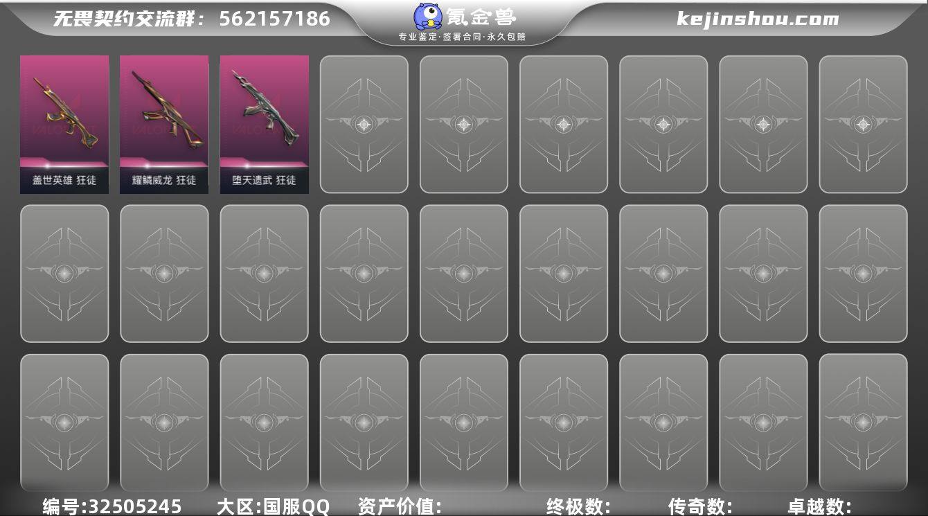 MWW604【游戏等级】Lv50 【段位】 未定级 【R点】330 【皮肤总价值】8,040 【英雄数量】13 【皮肤数量】9 【挂饰数量】23 【卡面数量】29 【喷漆数量】17 【幻影】幻影-异鳞魔蛇 幻影-奇幻朋克//3.0 【鬼魅】鬼魅-幻心猎手 【狂徒】狂徒-盖世英雄 狂徒-耀鳞威龙 狂徒-混沌序曲 狂徒-堕天遗武 【标配】标配-星际猎兵 标配-阿特拉斯指挥部