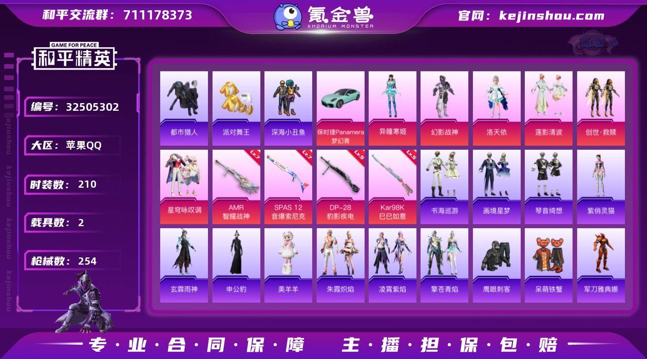 苹果 手Q-6粉装-7特效枪-2载具-2粉色飞行器-79409热力值-4王牌印记-210套装-254枪皮 【热门品类】:套装-都市猎人,套装-派对舞王,套装-深海小丑鱼,角色-军刀雅典娜,套装-忍者信条,套装-龟仙人,套装-暗影哥特 【粉色套装】:粉装-幻影战神,角色-洛天依,粉装-莲影清波,套装-创世·救赎,粉装-星穹咏叹调,角色-异瞳寒姬 【粉色枪皮等级】:ACE32-萌骑漫游(五级),AKS-74U-森灵之息(五级),Kar98K-巳巳如意(五级),Mk14-福马献瑞(五级),AMR-智耀战神(七级),SPAS-12-音爆索尼克(七级),DP-28-豹影疾电(五级) 【粉色载具】:保时捷Panamera(梦幻青),霜月冰狼 【粉色枪皮】:ACE32-萌骑漫游,AKS-74U-森灵之息,Kar98K-巳巳如意,Mk14-福马献瑞,AMR-智耀战神,SPAS-12-音爆索尼克,DP-28-豹影疾电 【粉色飞行器】:炫彩糖果飞行器,暮色之舞飞行器 【粉色降落伞】:幻影战神降落伞,洛神天依降落伞,环太平洋降落伞,仲夏莫吉托降落伞,圣堂之誓降落伞,江南烟雨降落伞,创世·救赎降落伞,忍者神龟降落伞,英伦信使降落伞,千金淑猫降落伞,彩虹独角兽降落伞,智耀战神降落伞,星穹咏叹调降落伞,幻彩电音降落伞,无垠阁降落伞,喜羊羊与灰太狼降落伞,异瞳寒姬降落伞...