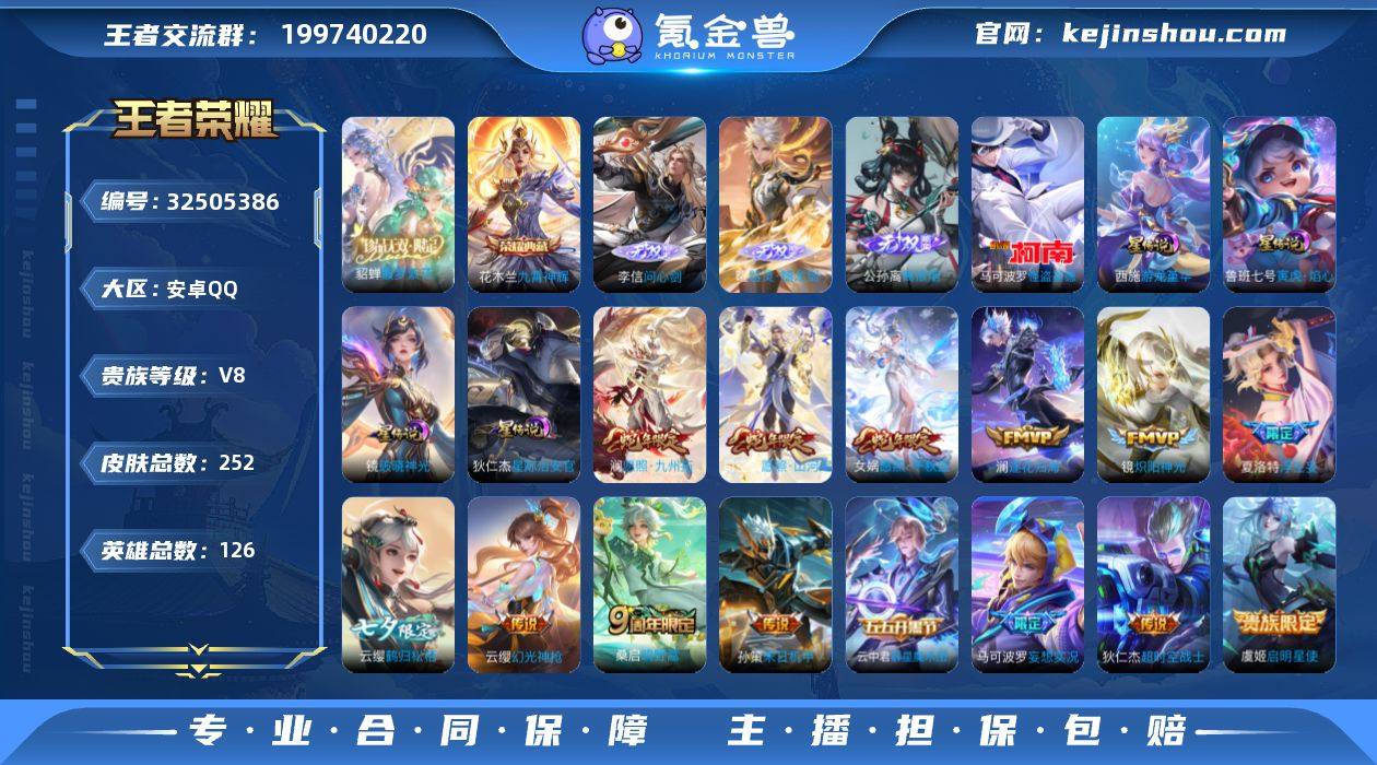 MCK631621 【死钱包!繁花!离恨烟!问心剑!】 皮肤数量252 印记总数6 【V8】 【尊贵铂金】 【暂时不可修改】 账号类型2 珍品无双1 无双3 荣耀典藏1 珍品1 星元皮肤4 传说15 史诗79 账号类型:射手号,打野号; 珍品无双:貂蝉_馥梦繁花; 无双:李信_问心剑,公孙离_离恨烟,曜_器灵螭龙剑; 荣耀典藏:花木兰_九霄神辉; 珍品:马可波罗_怪盗基德; 星元皮肤:西施_游龙堇华,鲁班_寅虎·焰心,镜_破晓神光,狄仁杰_星际治安官; 传说:虞姬_启明星使,镜_炽阳神光,张良_黄金白羊座,孙策_末日机甲,夏洛特_浮生妄,女娲_愿照千秋盛,司空震_愿照山河定,云缨_幻光神枪,澜_愿照九州拓,狄仁杰_超时空战士,马可波罗_妄想实况,桑启_鸣野蒿,云中君_群星魔术团,澜_逐花归海,云缨_鹤归松栖; 史诗:孙策_猫狗日记,妲己_热情桑巴,曹操_幽灵船长,元歌_无心,周瑜_线条小狗,孙尚香_蔷薇恋人,杨玉环_遇见飞天,公孙离_涂山容容,程咬金_功夫厨神,诸葛亮_黄金分割率,狄仁杰_鹰眼统帅,阿珂_节奏热浪,狂铁_龙之律动,露娜_紫霞仙子,阿珂_化蝶舞,狄仁杰_绮世丹青,李白_千年之狐,暃_星界游侠,亚连_糖绘人间,橘右京_修罗,小乔_缤纷独角兽,马可波罗_山海玄木吟,白...