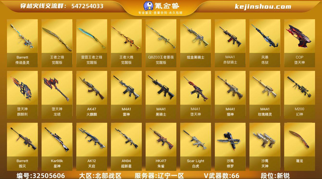 1传说圣灵/幻神三件套!辽宁一区-74V-7王者武器数-1炫金武器数 【传说武器】:传说圣灵 【热门武器】:传说圣灵,M14EBR-玄武,Scar Light-白虎,HK417-朱雀,M200-幻神,死亡之眼,Kar98K-星神,M4A1-黑骑士,羊驼玩偶,COP-堕天神,沙鹰-修罗*4 【王者炫金武器】:高爆手雷-雷霆王者,炫金骑士 【音效卡】:M200-幻神音效卡,M4A1-雷神音效卡,M4A1-黑骑士音效卡,Barrett-碧霄极光音效卡 【皮肤】:幻神-CFS2022,雷神-暗月,雷神-星空,雷神-烈虎皮肤,雷神-荣耀世冠AG,火麒麟-平天大圣,毁灭-黑大圣皮肤,毁灭-风暴,黑龙-能量核心,黑龙-暗月,黑骑士耀金皮肤,擎天-秘银 【角色】:迷迭香,雨棠,零·纪元,王者涂鸦,乔伊教练,修道士,初恋灵狐,芳心审判者,风暴女*2,虎妞,嘉年华灵狐,龙儿,龙儿-小淘气,曼陀罗-X,潘多拉-X,潘多拉-甜心教官,青霞仙子,蛇姬,蜀雪,铁骑荣耀,兔囡囡,雪莉杨,雪莉杨-摸金校尉,樱-缤纷夏日 【人偶武器】:巴雷特-零-水下丽影,AWM-灵狐-15周年嘉年华,迷你艾比 【暴走生化】:死亡之眼,超级对讲机 【挑战大师】:暴君乱世-超越Max,机甲撕裂者III 【英雄级武器】:AK47-火麒麟,M4A1-雷神,M4A1-黑骑士,AK12-天启,AN94-超...