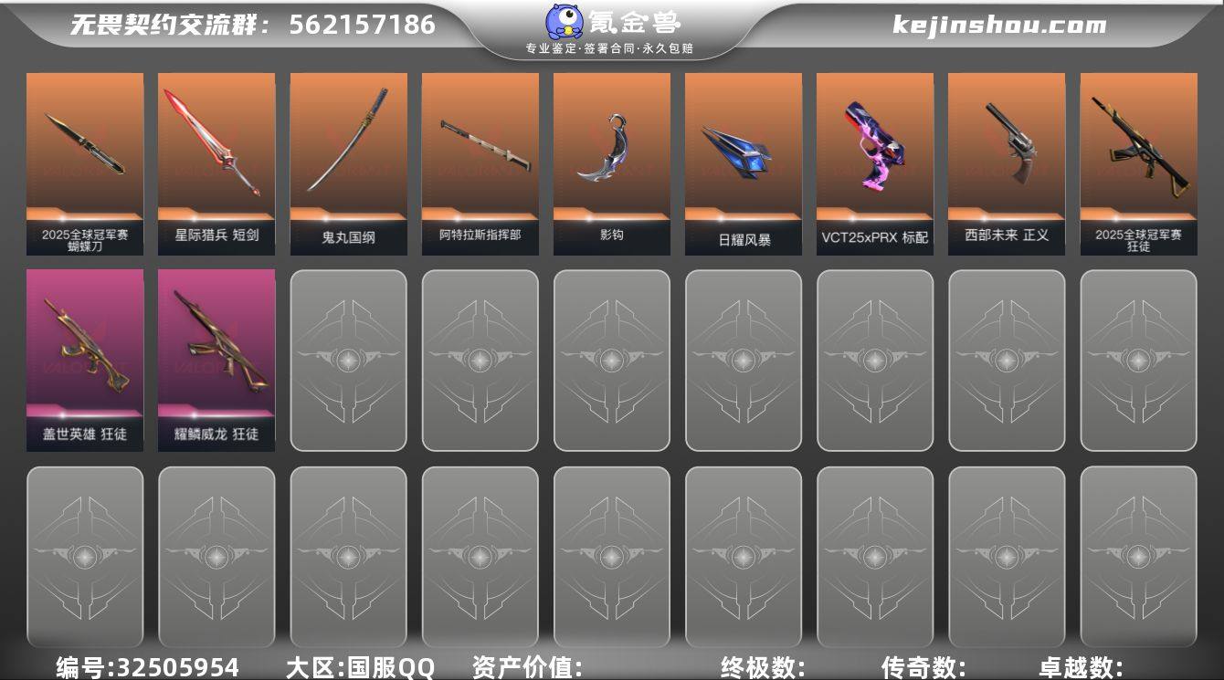 [皮肤价值37350 白银3 25冠军套]【游戏等级】Lv89 【段位】未定级 【R点】690 【皮肤总价值】37,350 【英雄数量】14 【皮肤数量】60 【挂饰数量】52 【卡面数量】78 【喷漆数量】73 【獠犬】獠犬-日冕雄师 獠犬-悠闲猫生 獠犬-幻语魔咒 【标配】标配-VCT25xPRX 标配-星际猎兵 标配-阿特拉斯指挥部 【近战武器】近战武器-星际猎兵短剑 近战武器-2025全球冠军赛蝴蝶刀 近战武器-阿特拉斯指挥部甩棍 近战武器-鬼丸国纲 近战武器-影钩 近战武器-日耀风暴遗器 近战武器-离子武器//2.0爪刀 近战武器-侦察力量蝴蝶刀 【狂徒】狂徒-2025全球冠军赛 狂徒-瑰梦艺语 狂徒-阿特拉斯指挥部 狂徒-盖亚的复仇 狂徒-掠影 狂徒-盖世英雄 狂徒-耀鳞威龙 【冥驹】冥驹-光环序列 冥驹-甜蜜战术 冥驹-混沌序曲 【幻影】幻影-星际猎兵 幻影-悠闲猫生 幻影-掠影//2.0 幻影-日耀风暴 幻影-侦察力量 【飞将】飞将-星际猎兵 飞将-悠闲猫生 飞将-幻语魔咒 【判官】判官-星际猎兵 判官-太空穿梭 判官-甜蜜战术 【戍卫】戍卫-光环序列 戍卫-太空穿梭 戍卫-甜蜜战术 【战神】战神-光环序列 战神-太空穿梭 【狂怒】狂怒-光环序列 狂怒-幻语魔咒 【鬼魅】鬼魅-瑰梦艺语 鬼魅-天界神兵 鬼魅-掠影//2.0 鬼魅-甜蜜...