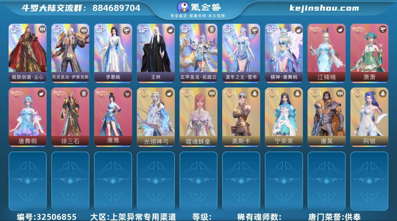 唐门荣誉:供奉 江楠楠,唐雅,唐舞桐,萧萧,徐三石 光翎神弓,噬魂蛛皇,奥斯卡,宁荣荣,唐昊,阿银 极致剑道·尘心 死灵圣法·伊莱克斯,李慕婉,王林,玄甲圣龙·拓跋云,凛冬之主·雪帝,蝶神·唐舞桐 卖家说:魂师几乎都有,皮肤也挺多的,养老号。