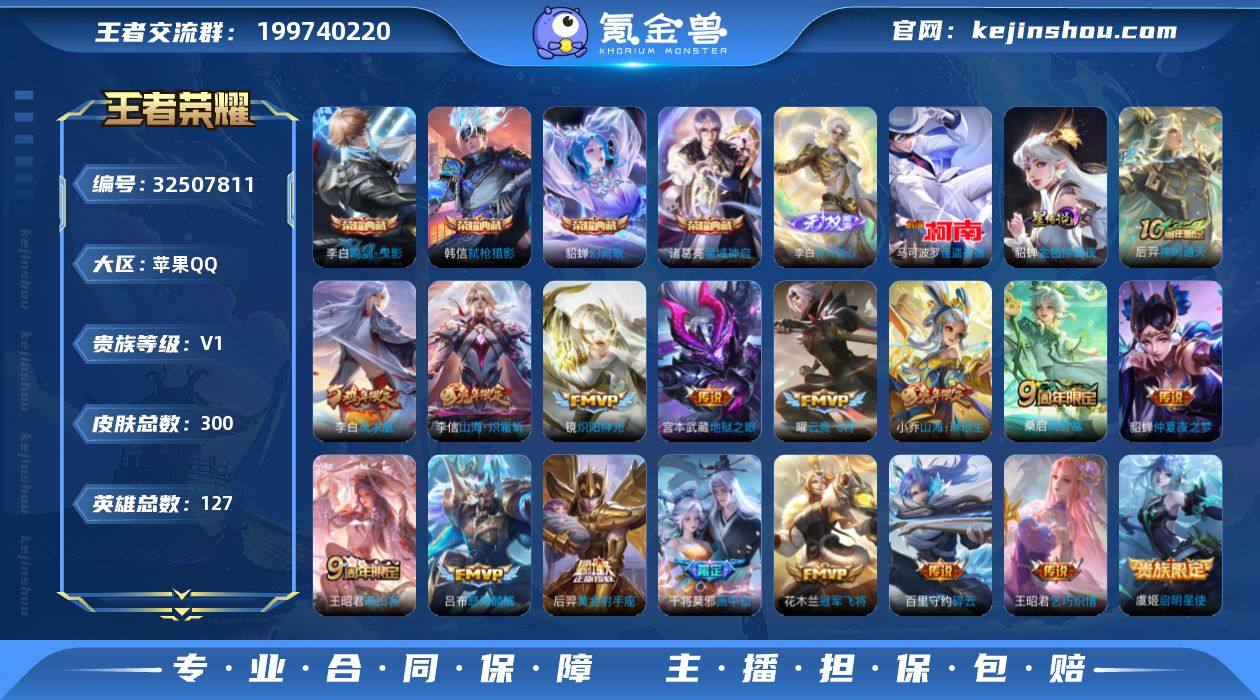 苹果Q-V0-永恒钻石II段位-127英雄-300皮肤-4典藏皮肤-1无双-1珍品传说-18传说-76史诗 【荣耀典藏】:李白鸣剑曳影,诸葛亮星域神启,貂蝉幻阙歌,韩信弑枪猎影 【无双皮肤】:李白碎月剑心 【珍品传说】:马可波罗怪盗基德 【传说皮肤】:后羿神树通天,王昭君映山客,桑启鸣野蒿,干将莫邪画中仙,小乔山海琳琅生,李信山海炽霜斩,吕布怒海麟威,百里守约碎云,王昭君乞巧织情,周瑜音你心动,镜炽阳神光,虞姬启明星使,曜云鹰飞将,花木兰冠军飞将,后羿黄金射手座,貂蝉仲夏夜之梦,李白凤求凰,宫本武藏地狱之眼 【限定皮肤】:白起狰,姜子牙天穹之誓,狄仁杰阴阳师,小乔山海琳琅生,赵云皇家上将,嬴政白昼王子,鲁班七号狮舞东方,芈月重明,吕布猎兽之王,夏侯惇朔风刀,曹操烛龙,典韦穷奇,马可波罗山海玄木吟,狄仁杰魔术师,狄仁杰万华元夜,达摩沙漠行僧,项羽海滩派对,老夫子醍醐杖,关羽冰锋战神,程咬金演武夺筹,王昭君午后时光,花木兰青春决赛季,孙悟空至尊宝,孙悟空大圣娶亲,牛魔御旌,后羿辉光之辰,李元芳银河之约,虞姬启明星使,钟馗神迹守卫,钟馗驱傩正仪,干将莫邪胡桃夹子,干将莫邪画中仙,雅典娜黎明之约,太乙真人饕餮,鬼谷子原初探秘...