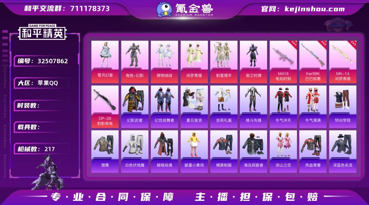 次】【因赛季更新游戏段付以上号为准!】 苹果Q-1稀有6粉装6特效枪8热门152套装217枪皮 13印记 历史超级王牌9星 【1稀有】 AKM-缤纷海域 【6粉装】 虎痴许褚 雪月幻音 射星猎手 闲梦青缨 宙之时溯 萌物绒绒 【6特效枪】 M416-电玩时刻 (5级) Kar98K-巳巳如意 (5级) DP-28-豹影疾电 (5级) Mk14-闲梦青缨 (7级) Mk14-福马献瑞 (5级) UMP45-萌骑冒险 (5级) 【8热门】 Mark.06 龟仙人 2P战斗服款 团圆交子 瑞龙福将 破蛋小黄鸡 M762-奇异狩猎者 M762-瑞龙福将 【3飞行器】 鎏金朋克飞行器 萌物绒绒飞行器 星夜魔法师飞行翼