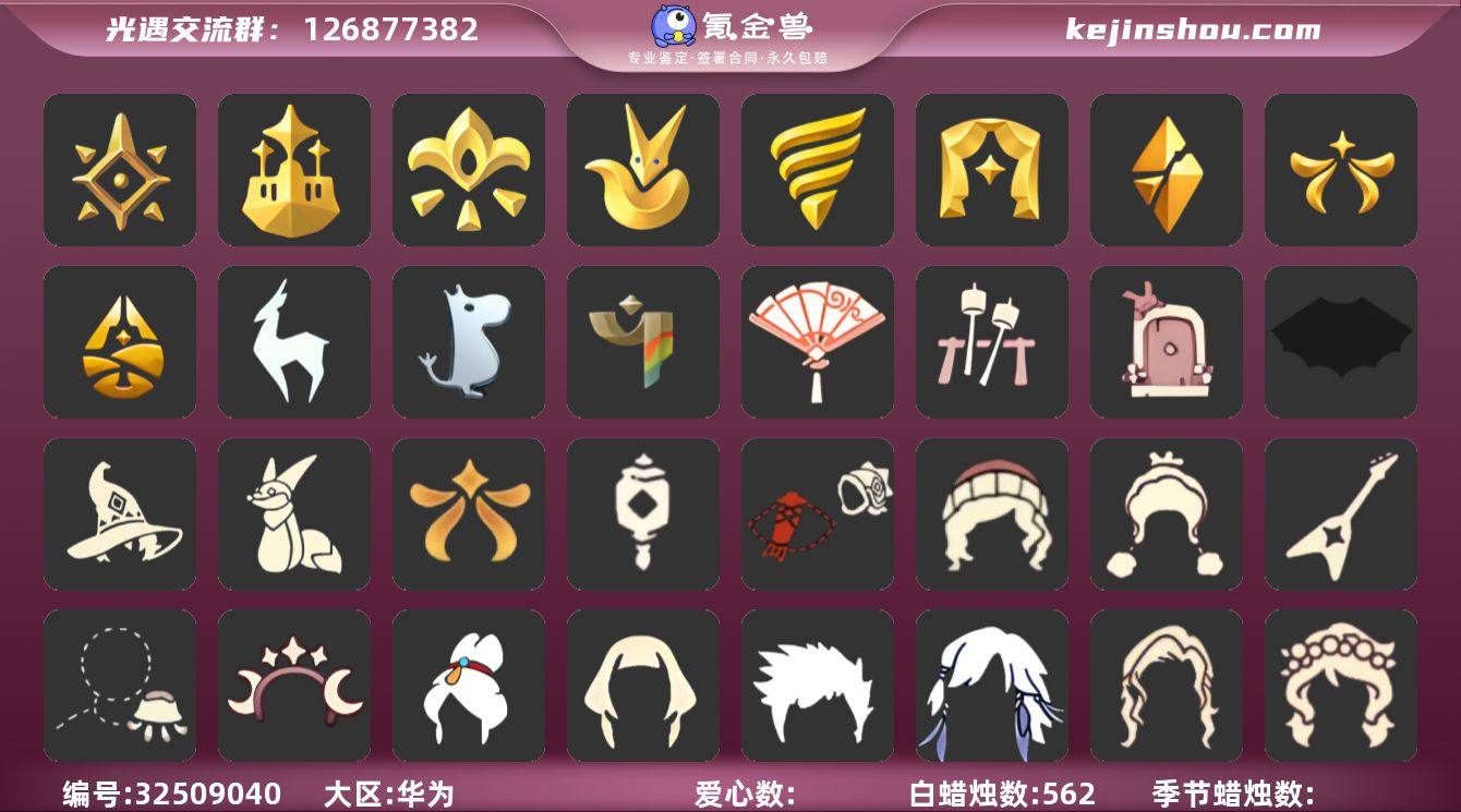 蜡烛数:562/爱心数:435/晨岛/云野/雨林/霞谷/墓土/禁阁/预言季/梦想季/集结季/小王子季/潜海季/表演季/破晓季/欧若拉季/归巢季/九色鹿季/姆明季/彩染季/阿努比斯(狗头)/圆鼓/凤凰面具/凤凰斗篷/队长面具/小王子发型/小王子套装/玫瑰花/单边小辫/暗红斗篷/黄眉企鹅面具/燕尾斗篷/冥龙斗篷/留辫蘑菇头/高领舞服/透明蝶翼斗/粗框眼镜/五塑彩羽发/五塑彩带斗/设计师长袍/姆明抱枕/辉光羚羊面具/彩染围巾斗篷/跃动跑鞋/神鹿祝福礼包/水母/绒帽/彩虹帽/巫师/鲤鱼套/星月头饰/巫树犄角/圣诞鹿角/欧若拉之翼/蝙蝠套/蛛丝斗篷/白雪斗篷/惊喜手杖/灯笼/献瑞折扇礼包/花憩茶桌/小狐狸/冥龙南瓜/篝火点心礼包/仙境茶会门扉礼包/武士裤/背带裤/搓澡巾/虚荣/花环/红耳机/若笠/白金斗篷/黑金斗篷/红金斗篷/雨伞/高音钢琴/黄鼠狼/羊头面具/星月头冠/水母肩饰/猫耳/归巢毕业发型/花环长发/飞天盘发/帝企鹅发/贝壳发饰/雪花发夹/创始人斗篷/围巾斗篷/瑞雪斗篷/斜边队长斗篷/雪花水晶球/情人小船/电吉他/篝火点心/情人跷跷板/情人秋千/中秋灯笼/瑞气纸伞/立式钢琴
