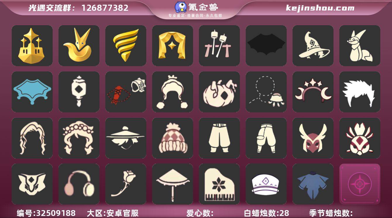 蜡烛数:28/爱心数:10/云野/雨林/霞谷/墓土/禁阁/梦想季/小王子季/潜海季/表演季/凤凰面具/凤凰斗篷/小王子发型/小王子套装/玫瑰花/蓝黄羽袖/单边小辫/黄眉企鹅面具/燕尾斗篷/合奏挂画/神鹿祝福礼包/水母/绒帽/巫师/鲤鱼套/星月头饰/巫树犄角/圣诞鹿角/南瓜/年年有鱼礼包/蝙蝠套/蛛网斗篷/瑞雪/白雪斗篷/音韵吉他/灯笼/花憩茶桌/小憩茶桌/小狐狸/冥龙南瓜/篝火点心礼包/武士裤/搓澡巾/虚荣/花环/红耳机/若笠/平顶帽/白金斗篷/红金斗篷/雨伞/高音钢琴/黄鼠狼/星月头冠/水母肩饰/猫猫头/花环长发/帝企鹅发/贝壳发饰/玉兔发饰/雪花发夹/创始人斗篷/小王子围巾/雪花水晶球/篝火点心/情人秋千/中秋灯笼