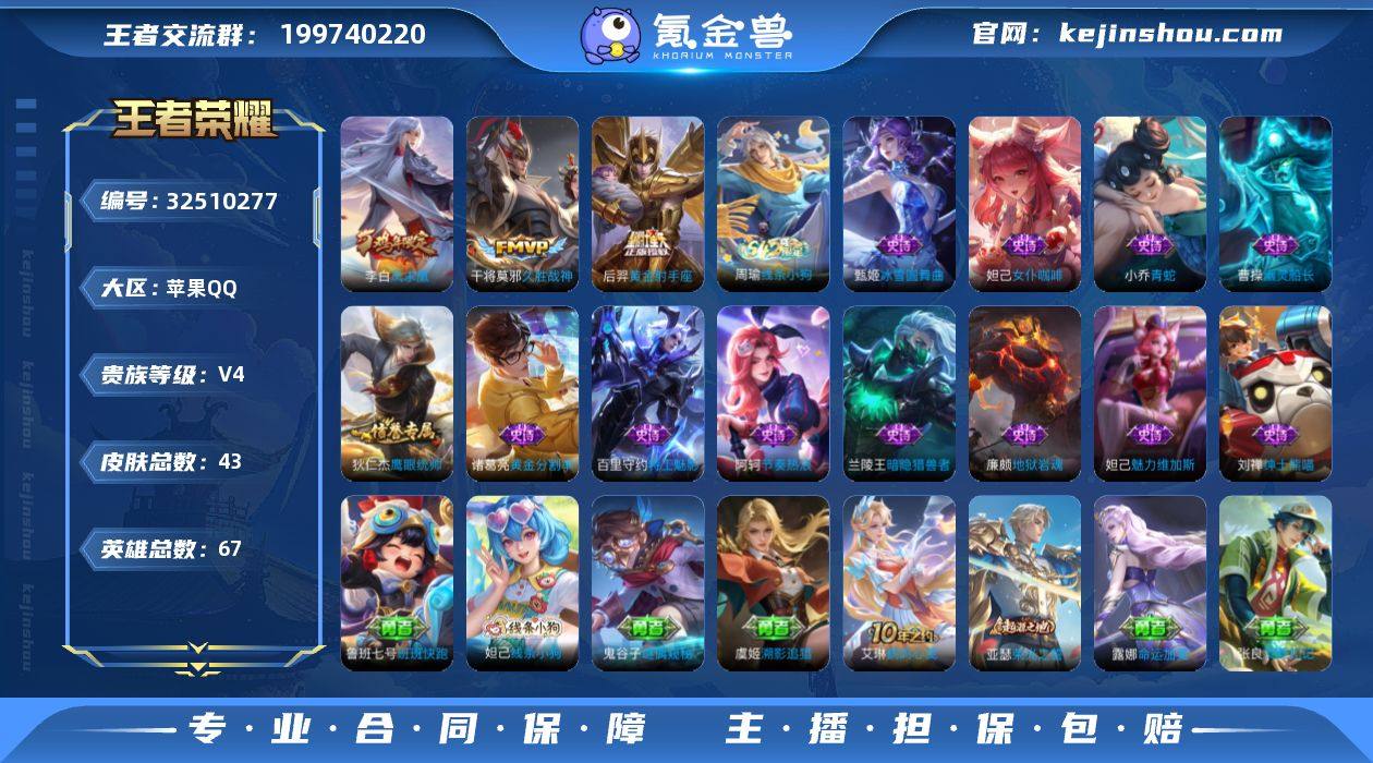 苹果Q-V4-最强王者段位-67英雄-43皮肤-3传说-12史诗【传说皮肤】:干将莫邪久胜战神,后羿黄金射手座,李白凤求凰【限定皮肤】:狄仁杰阴阳师,项羽海滩派对,沈梦溪龙舞盛年【年限皮肤】:李白凤求凰【赛季限定】:钟馗虚灵犬护,亚瑟荣光之誓【战令限定】:周瑜线条小狗【史诗皮肤】:周瑜线条小狗,小乔青蛇,狄仁杰鹰眼统帅,阿轲节奏热浪,百里守约特工魅影,诸葛亮黄金分割率,兰陵王暗隐猎兽者,曹操幽灵船长,刘禅绅士熊喵,妲己女仆咖啡,妲己魅力维加斯,廉颇地狱岩魂,甄姬冰雪圆舞曲【其他皮肤】:鲁班七号班班快跑,妲己线条小狗,鬼谷子谜偶窥秘,虞姬溯影追猎,艾琳鹤鸣心笺,亚瑟荣光之誓,露娜命运加冕,张良灵野札记,苏烈春野闲踪,钟馗虚灵犬护,沈梦溪龙舞盛年,小乔丁香结,刘备汉昭烈帝,狄仁杰阴阳师,后羿阿尔法小队,宫本武藏万象初新,亚瑟死亡骑士,姜子牙时尚教父,赵云白执事,露娜哥特玫瑰,项羽海滩派对,盘古创世神祝,孙策海之征途,苍维京掠夺者,夏侯惇战争骑士,后羿精灵王,鲁班七号福禄兄弟【营地ID】:1839659085【小国标】:小国标扁鹊【金标】:金标干将莫邪