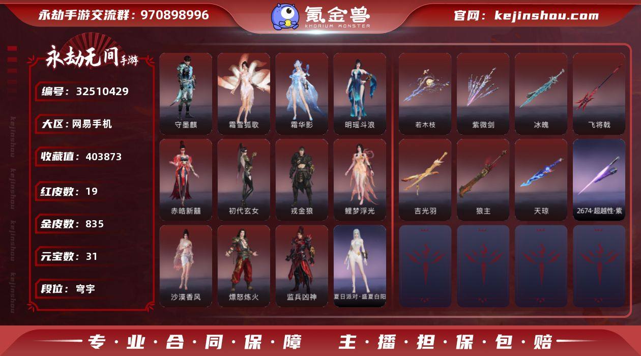 WJ5493,网易手机手游,4月21可换绑,四人段位穹宇2,19红,835金,DVa战斗机甲,金人俑,赤莲,神君印,凶虎,神乌造像,炎烈珠,御海之灵,紫微剑,冰魄,2674超越型紫,吉光羽,狼主,飞将戟,天琼,若木枝,赤皓新囍,初代玄女,戎金狼,鲤梦浮光,沙漠香风,熛怒炼火,监兵凶神,明瑶斗浪,霜华影,霜雪狐歌,守墨麒,至纯,生死局,过江龙,精武魂,椰风夕照,绮夏幻梦,盛夏白阳,隐锋,醉花风,星辉环月,金刚心念,烈豪,掌珠仙子,奉生者,悠竹萌客,劫妹飞船,男性发型14,