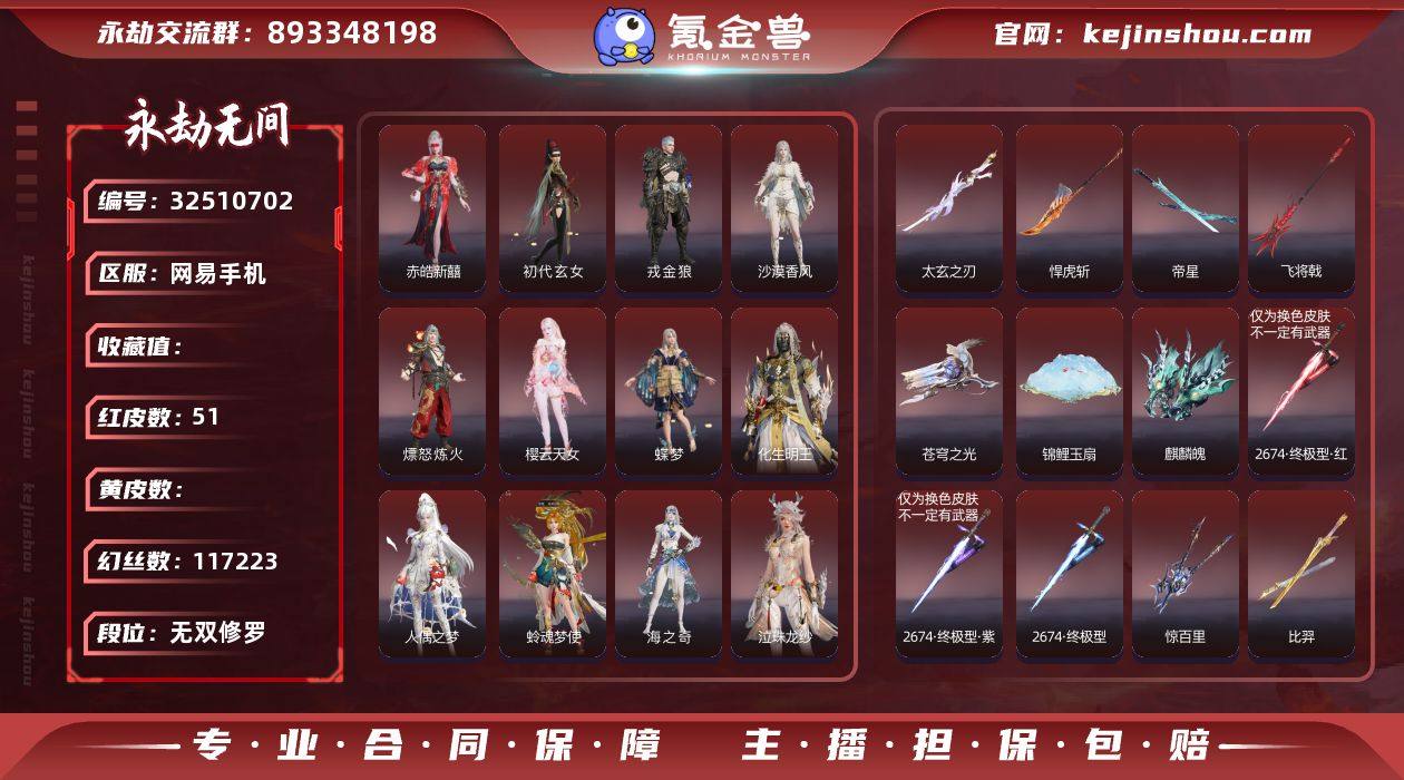 WJ5455,网易手机,4月18日可换绑,51红924金,等级704,收藏值778829,3谪星,三人段位无间修罗,幻丝117223,金砖109,通行证Lv.55,声望1,变身器,勾玉,千秋匠心凶虎,噬骨,揽九天,霜翎,白龙真身,雷云敕雨令,2674初代机,御祥云,炎烈珠,荆魂,神君印,谪星2P,谪星寻道,3孔,2黄,1红,谪星神劫,3孔,2黄,1红,红色神品,香雪水兰,暮光胴丸,沙漠香风,监兵凶神,夜魅游莹,星辉魔纱,朱雀星衣,化道者,执明神君,流金晓锦,守墨麒,命定之辉,画中仙,化生明王,戎金狼,赤皓新囍,初代玄女,熛怒炼火,樱云天女,蝶梦,人偶之梦,阴阳师蛉魂梦使,泣珠龙纱,海之奇,青龙将星,天罚,苍穹之光,麒麟魄,帝星,比羿,烈阳,狼主,悍虎斩,飞将戟,涯角,灵犀,如意金箍棒,天琼,锦鲤玉扇,逆晦朔,狂龙,少阳剑,冰魄,2674终极型,诡月幽蔷,惊百里,太玄之刃,2674九阴,灵狐幻刃,2674终极型紫,2674终极型红,角色金色皮肤,禄运玉霄,紫微星命,龙吉公主,自动人形A2,金襦玉衫,仙剑奇侠传赵灵儿,赤丹朱湛,寒英素雪,姑射真人,烈武者,铸神风卫天翎,击浪,麟鹿大铠,苍雷丸,不知火舞,千秋匠心玉叶景,胡旋女,神鹰之女,火罗圣女,惊云羽,浣...