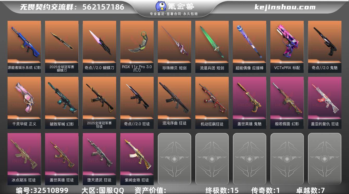 w4652 【性价比】大圣狂徒 25套 奇点2.0套 堕天狂徒 混沌狂徒 盖亚狂徒 显卡爪刀 冰点狂徒 大圣鬼魅 电玩幻影 vctprx标配 恶鬼幻影 莲花正义 紫金狂徒 机动狂徒 破败幻影 剥皮小刀库存: 35270剩余VP:54剩余R点:0 段位:青铜