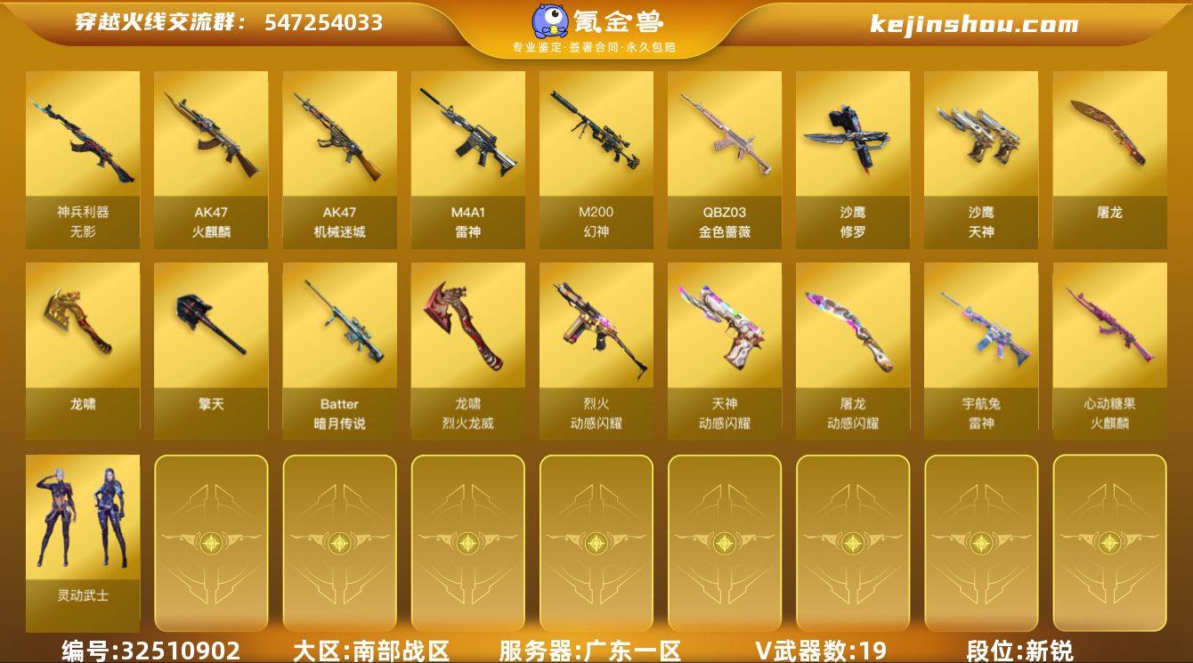 【ky6390】广东一区-19V-0王者武器数-0炫金武器数 【热门武器】:QBZ03-金色蔷薇,M200-幻神,死亡之眼*2,金色蔷薇-空,沙鹰-修罗*3 【音效卡】:屠龙-动感闪耀 音效卡 【皮肤】:雷神-宇航兔皮肤,火麒麟-心动糖果 【角色】:乔伊教练,暗夜-X,嘉年华灵狐,灵动武士,曼陀罗-X,曼陀罗-礼服,潘多拉-X,斯沃特-X 【人偶武器】:金色蔷薇-空,AWM-灵狐-15周年嘉年华,COP-旗袍 【暴走生化】:死亡之眼*2 【挑战大师】:AK47-冰龙粉碎者 【英雄级武器】:AK47-火麒麟,M4A1-雷神,AK47-机械迷城,无影-神兵利器,QBZ03-金色蔷薇,烈火-动感闪耀,M200-幻神,Barrett-暗月传说,沙鹰-修罗*3,沙鹰-天神,天神-动感闪耀,屠龙,龙啸,擎天,屠龙-动感闪耀,龙啸-烈火龙威,手雷-动感闪耀 【源级武器】:源·火麒麟,源·雷神*2,魂·雷神-维纳斯,魂·雷神-15周年嘉年华,御·雷神-烈虎,魂·黑骑士-现代金属,魂·黑骑士-幻能朋克,魂·黑骑士-破浪10年,源·AK47-黑武士,源·超新星,源·机械迷城,魂·龙血-锋芒破茧,魂·QBZ03-金色蔷薇-萌杀,源·天龙*2,源·毁灭,御·毁灭-黑大圣,源·Barrett-朱雀,魂·炼狱-玩具枪,御·炼狱-女娲,魂·修罗-15周年嘉年华,源·天神,魂·屠龙-都是Cfer,...