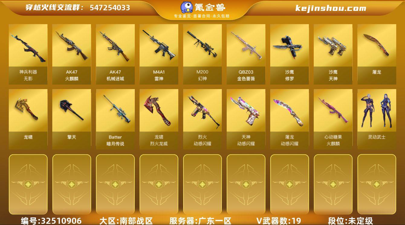 广东一区-19V-0王者武器数-0炫金武器数 【热门武器】:QBZ03-金色蔷薇,M200-幻神,死亡之眼*2,金色蔷薇-空,沙鹰-修罗*3 【音效卡】:屠龙-动感闪耀 音效卡 【皮肤】:雷神-宇航兔皮肤,火麒麟-心动糖果 【角色】:乔伊教练,暗夜-X,嘉年华灵狐,灵动武士,曼陀罗-X,曼陀罗-礼服,潘多拉-X,斯沃特-X 【人偶武器】:金色蔷薇-空,AWM-灵狐-15周年嘉年华,COP-旗袍 【暴走生化】:死亡之眼*2 【挑战大师】:AK47-冰龙粉碎者 【英雄级武器】:AK47-火麒麟,M4A1-雷神,AK47-机械迷城,无影-神兵利器,QBZ03-金色蔷薇,烈火-动感闪耀,M200-幻神,Barrett-暗月传说,沙鹰-修罗*3,沙鹰-天神,天神-动感闪耀,屠龙,龙啸,擎天,屠龙-动感闪耀,龙啸-烈火龙威,手雷-动感闪耀 【源级武器】:源·火麒麟,源·雷神*2,魂·雷神-维纳斯,魂·雷神-15周年嘉年华,御·雷神-烈虎,魂·黑骑士-现代金属,魂·黑骑士-幻能朋克,魂·黑骑士-破浪10年,源·AK47-黑武士,源·超新星,源·机械迷城,魂·龙血-锋芒破茧,魂·QBZ03-金色蔷薇-萌杀,源·天龙*2,源·毁灭,御·毁灭-黑大圣,源·Barrett-朱雀,魂·炼狱-玩具枪,御·炼狱-女娲,魂·修罗-15周年嘉年华,源·天神,魂·屠龙-都是Cfer,魂·擎天-破...