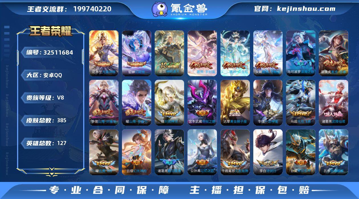 安卓Q-V8-至尊星耀IV段位-127英雄-385皮肤-2典藏皮肤-31传说-128史诗 【英雄全皮】:刘禅全皮,孙权全皮,戈娅全皮,空空儿全皮 【荣耀典藏】:花木兰九霄神辉,貂蝉幻阙歌 【传说皮肤】:后羿神树通天,女娲愿照千秋盛,妲己愿照众生和,虞姬愿照岁时盈,云缨幻光神枪,上官婉儿妄想奇谈,马可波罗妄想实况,东皇太一灼幽烈阳,诸葛亮鹤羽星尊,张飞百相守梦,公孙离记忆之芯,花木兰燃星之曲,曜山海苍雷引,李信山海炽霜斩,吕布怒海麟威,李白诗剑行,马可波罗深海之息,马超无双飞将,孙策末日机甲,裴擒虎寅虎赤拳,铠绛天战甲,镜炽阳神光,虞姬启明星使,孙悟空零号赤焰,曜云鹰飞将,李信一念神魔,刘备时之恋人,干将莫邪久胜战神,达摩黄金狮子座,诸葛亮武陵仙君,宫本武藏地狱之眼 【限定皮肤】:白起狰,蒙犽顽岩魄,姜子牙天穹之誓,狄仁杰阴阳师,虞姬凯尔特女王,赵云皇家上将,赵云龙胆,嬴政优雅恋人,孙尚香蔷薇恋人,庄周高山流水,高渐离死亡摇滚,钟无艳超时空战士,孙膑妖精王,扁鹊炼金王,扁鹊奇幻香踪,白起夜都怪侠,芈月幻夜卜梦,元歌云间偶戏,元歌无心,夏侯惇匿光决锋者,甄姬游园惊梦,甄姬落雪兰心,曹操烛龙,典韦蓝屏警告,马可波罗暗影...