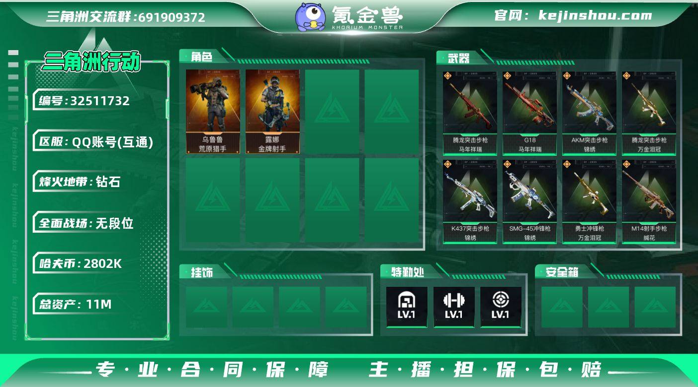 【SJZF6709】总资产(M):11M/哈夫币(K):2802K/哈夫币(K):2802K/传说枪皮数:18/全面战场等级:1_段位:无段位/烽火地带等级:60_段位:钻石/露娜-金牌射手(S7)/乌鲁鲁-荒原猎手/近战-黑鹰/AKM突击步枪-锦绣/SG552突击步枪-运动员/SG552突击步枪-点翠/腾龙突击步枪-马年祥瑞/腾龙突击步枪-万金泪冠/K437突击步枪-锦绣/KC17突击步枪-点翠/SMG-45冲锋枪-锦绣/勇士冲锋枪-万金泪冠/MP7冲锋枪-趣味文化/M14射手步枪-蛮荒/M14射手步枪-缄花/SKS射手步枪-骑士/SR-25射手步枪-缄花/PSG-1射手步枪-点翠/AWM狙击步枪-万金泪冠/.357左轮-缄花/G18-马年祥瑞/K416突击步枪-冬日风情/K416突击步枪-腊梅/AUG突击步枪-蝮蛇/M7战斗步枪-百步穿杨/G3战斗步枪-流沙送葬/G3战斗步枪-哈夫克警备/AS Val突击步枪-百步穿杨/腾龙突击步枪-猎鳄行动/K437突击步枪-丛林谍踪/MP5冲锋枪-竞技风/Vector冲锋枪-百步穿杨/SMG45冲锋枪-阿萨拉特攻/SR-3M紧凑突击步枪-开工大吉/勇士冲锋枪-深海恐惧/勇士冲锋枪-丛林谍踪/MP7冲锋枪-六套之力/PKM通用机枪-蝮蛇/M249轻机枪-丛林谍踪/QJB201轻机枪-炽焰/VSS射手步枪-丛林谍踪/M14射手步枪-工业狂潮/M700狙击步枪-百步穿杨/AWM狙击步枪-流沙送葬/M700狙击步枪-旧梦...
